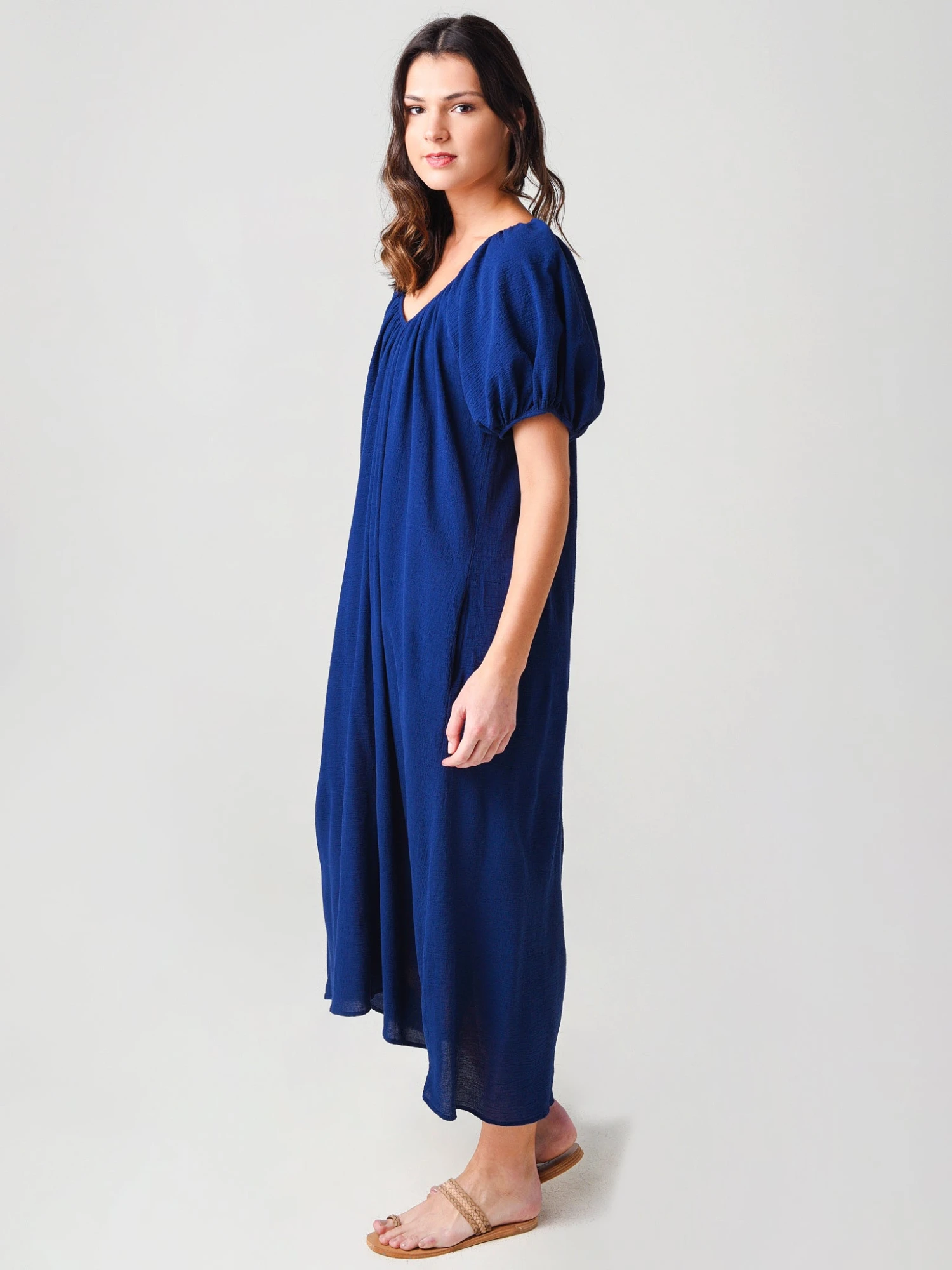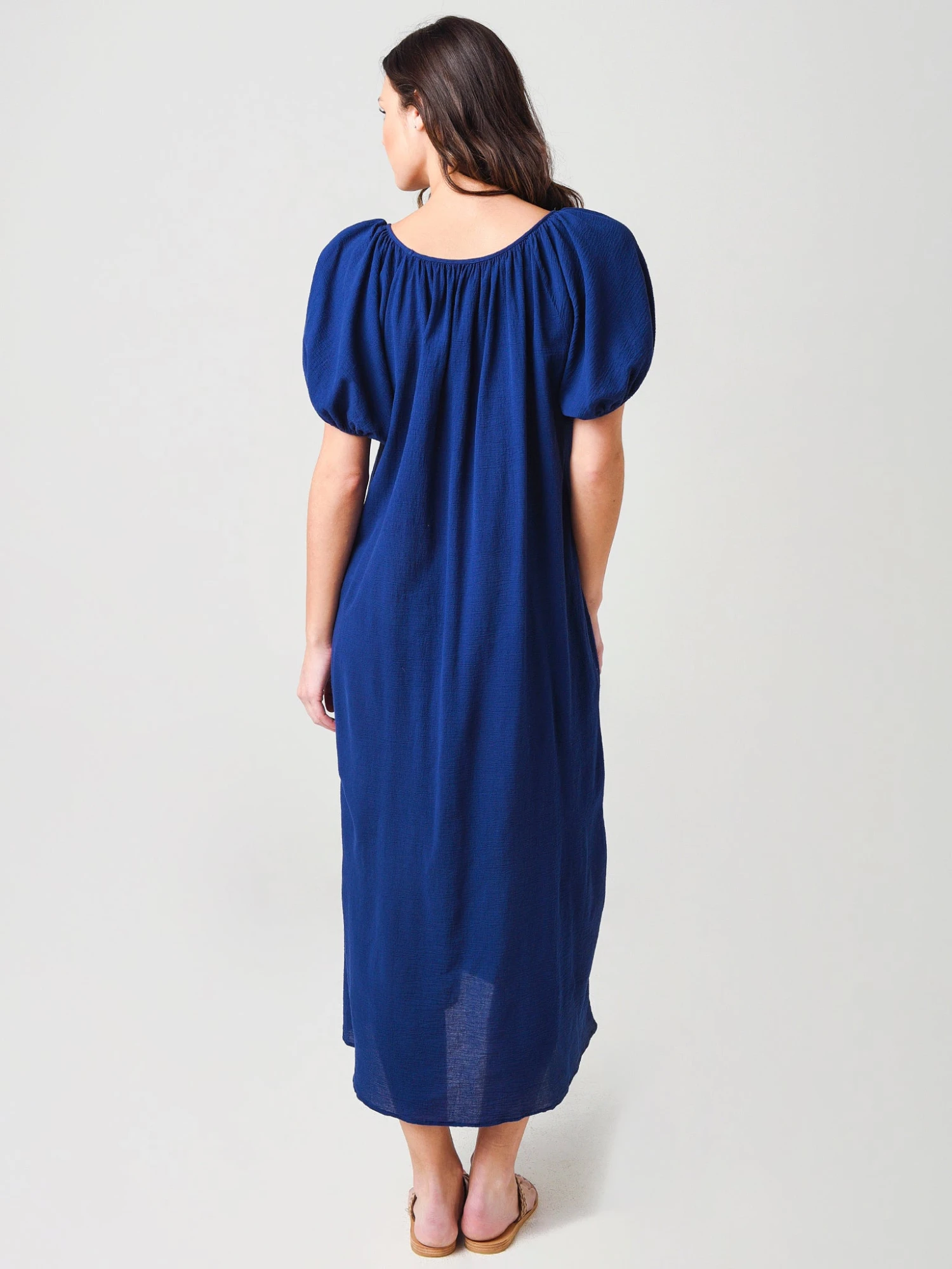 FEATURES:Cover-Up CaftanAnkle-Length MaxiV-NecklineShort Puff Sleeve with Elastic CuffsOn-Seam PocketsLightweightRelaxed FitMade in USA100% Cotton