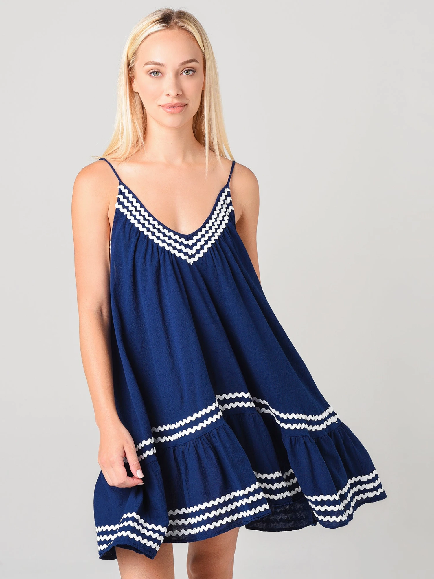 FEATURES:Mini Dress, Cover-Up DressV-NecklineThin Spaghetti StrapsTonal Ric-Rac Trim ThroughoutDrop WaistDelicate PleatsFlared SkirtMade in USA100% CottonModel is wearing size Small dress.Model’s Measurements: Height: 5’10.5″; Bust: 32C; Waist: 25″; Hips: 36″; Dress Size: 4 (US)