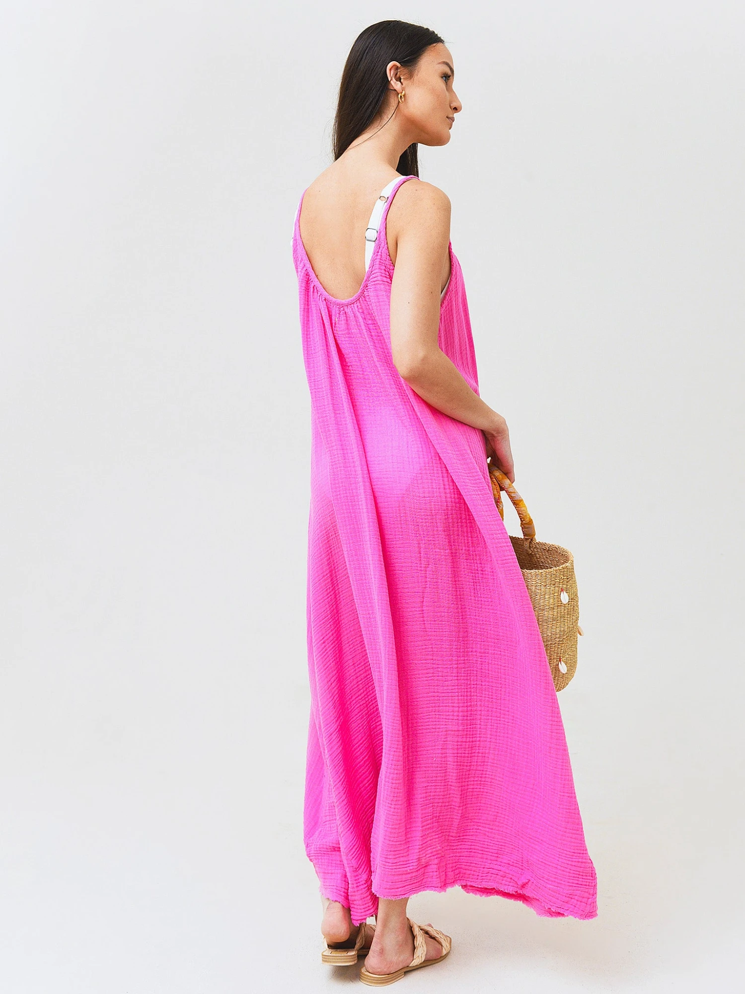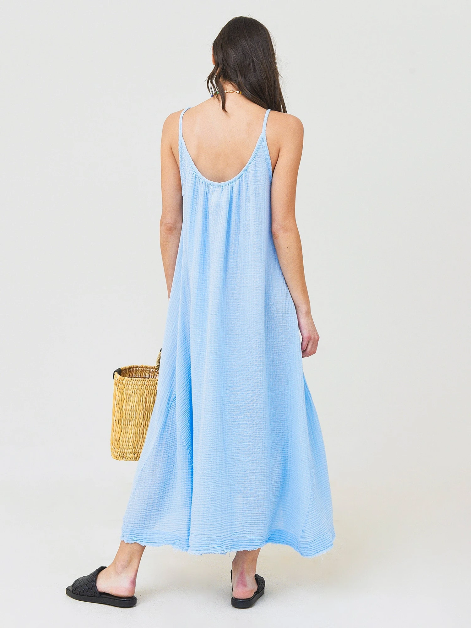 FEATURES:Cover-UpScoop Neckline and BackThin, Fixed StrapsRaw Edge HemMaxi SilhouetteCrinkle Gauze Fabrication100% CottonRelaxed FitModel is wearing One Size cover-up.Zinnia, White: Model’s Measurements: Height: 5’9″ | Bust: 32B | Waist: 24″ | Hips: 36″ | Dress Size: 2 (US)Cielo: Model’s Measurements: Height: 5’9.5″ | Bust: 34A | Waist: 26.5″ | Hips: 37″ | Dress Size: 2-4 (US)Black: Model’s Measurements: Height: 5’9″ | Bust: 34B | Waist: 26″ | Hips: 37″ | Dress Size: 2-4 (US)