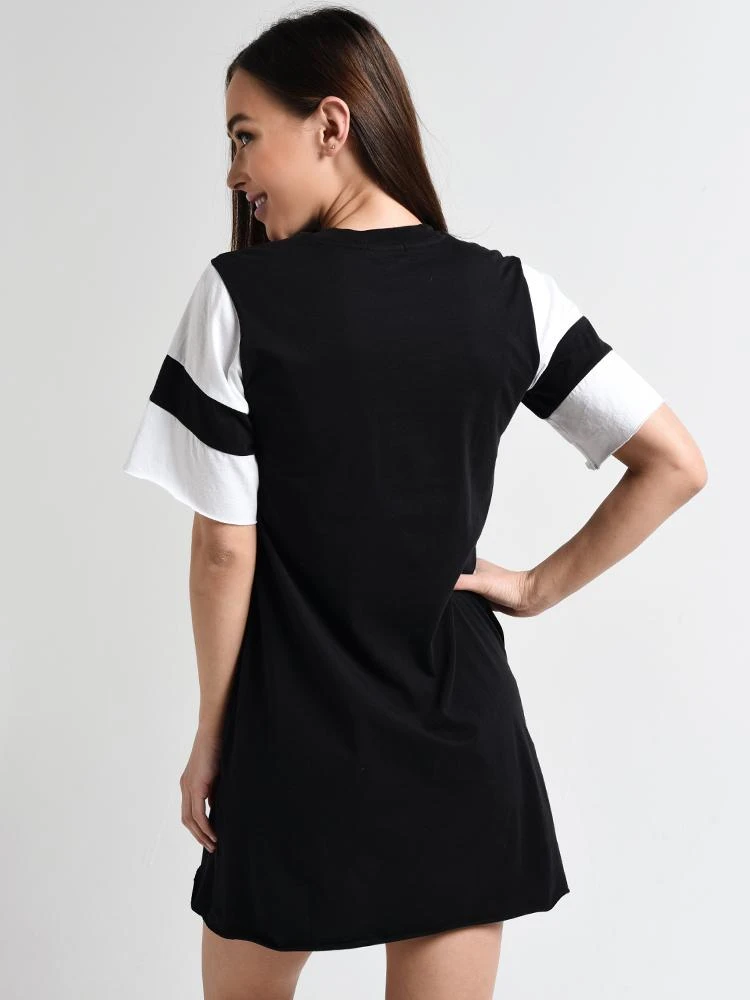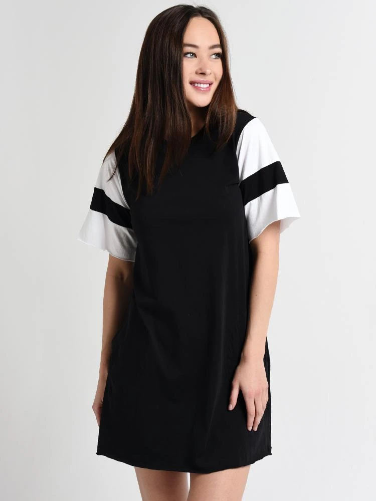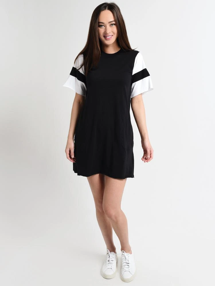 FEATURES:Shirt DressCrew NeckShort SleeveRelaxed FitStripe Jersey Detail at SleevesLoose A-Line Silhouette100% CottonStyled with VEJA Sneakers style # EA2001W. Model is wearing size Small dress.