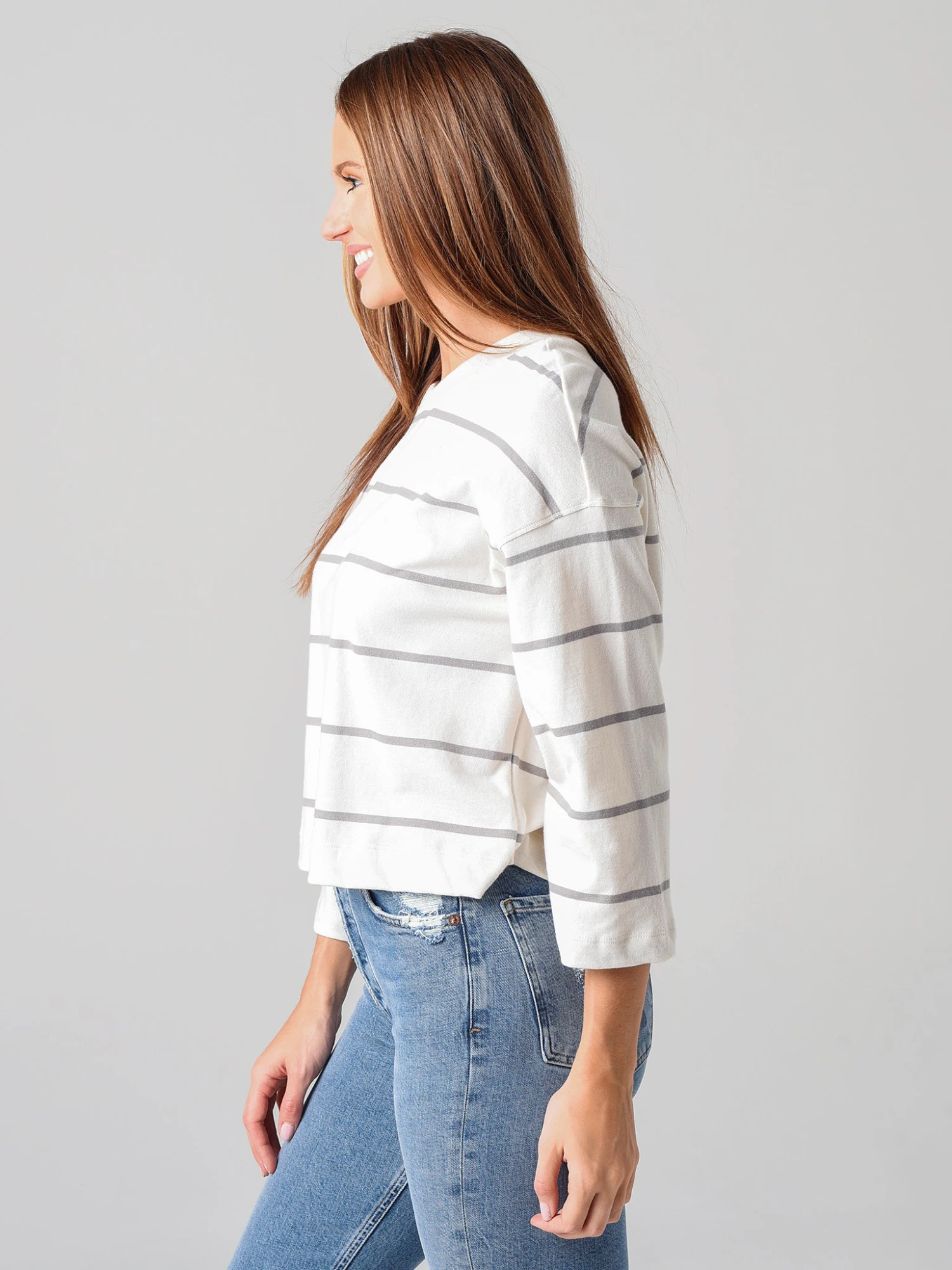FEATURES:Sweatshirt TopCrew Neckline, Wide, Ribbed3/4 SleeveDropped ShoulderStripe PatternWide Turnback Hem and Sleeve CuffsCropped and Boxy Silhouette100% CottonModel is wearing size Small sweatshirt top.Model’s Measurements: Height: 5’9″; Bust: 32B; Waist: 26″; Hips: 37.5″; Dress Size: 4 (US)