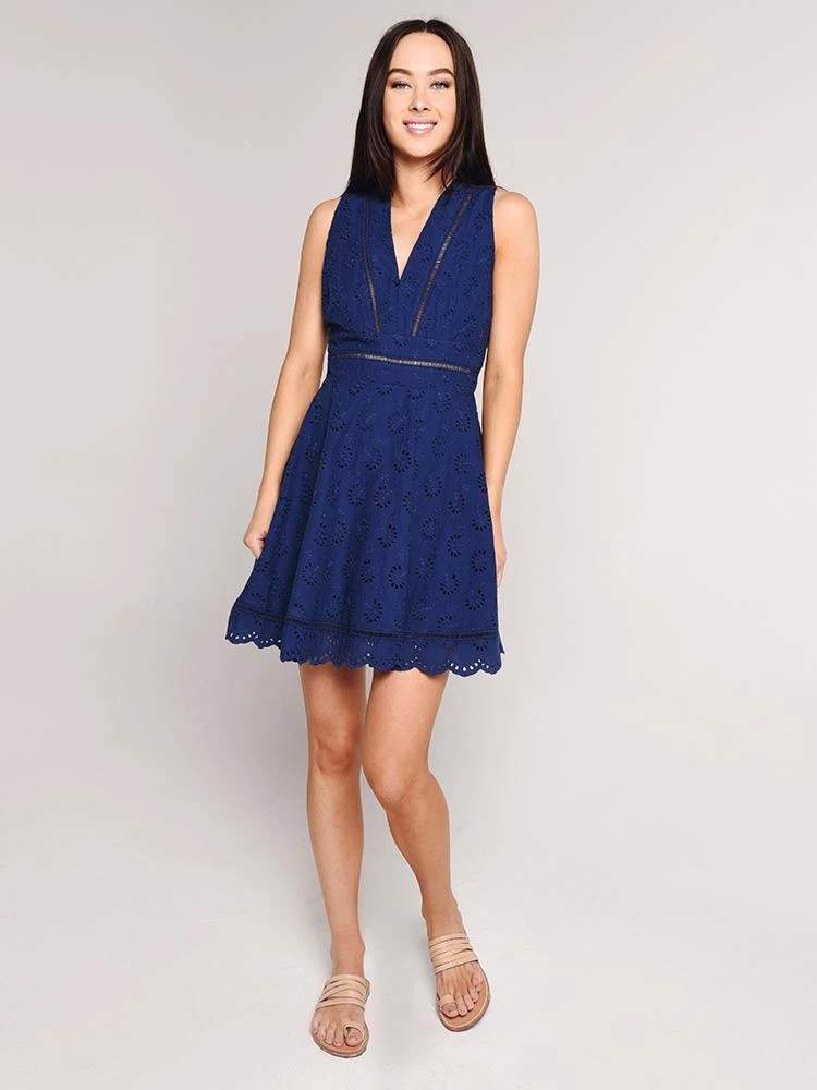 FEATURES:Fit and flare styleLatice trimEyelet fabric SleevelessImported Model is wearing size 2 dress.