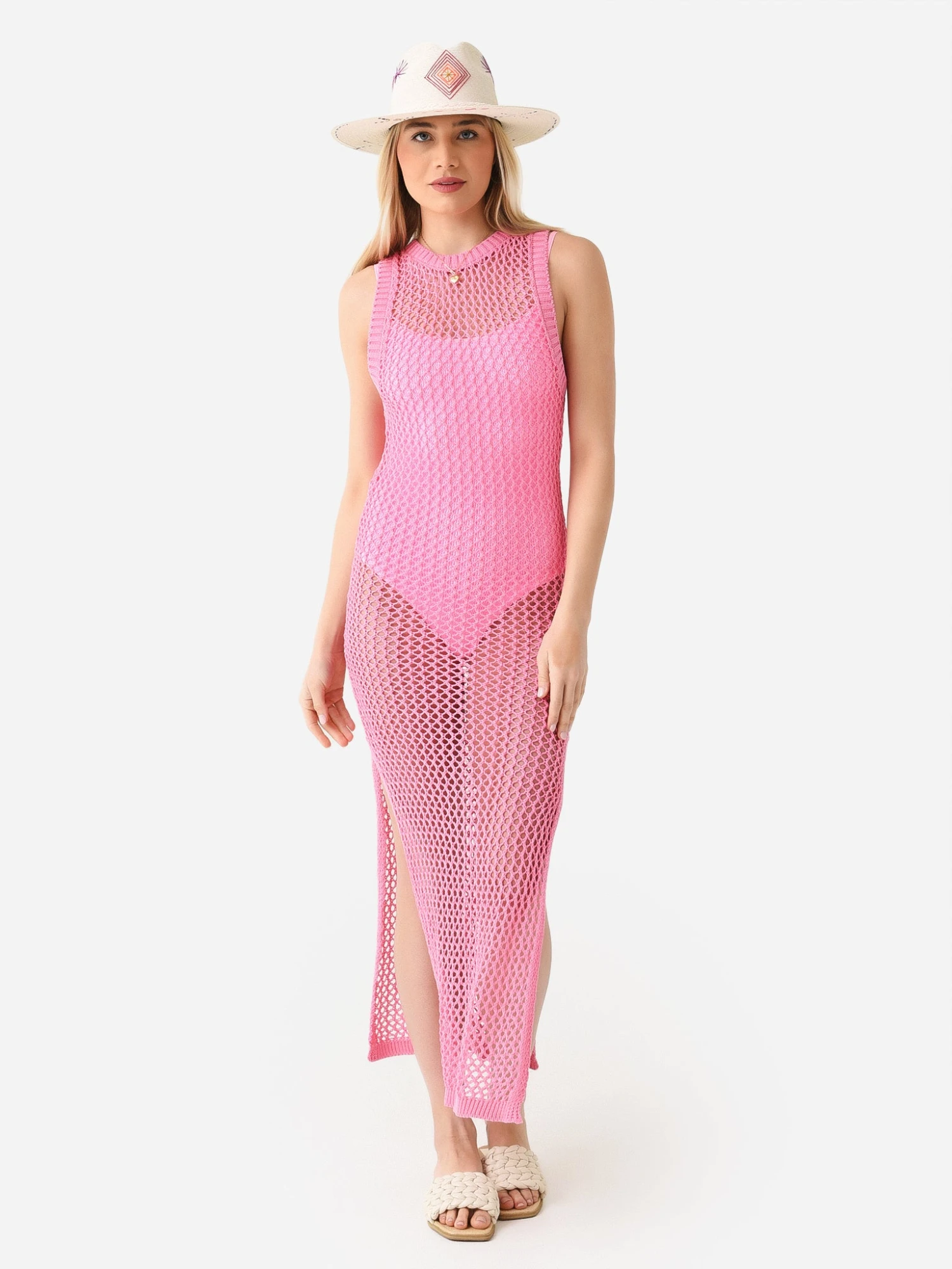 FEATURES:Cover-UpRound NecklineSleevelessOpen BackSide SlitsLong SilhouetteStraight HemOpen Knit Crochet Fabrication100% CottonClassic FitModel is wearing size Small cover-up.Model’s Measurements: Height: 5’9″ | Bust: 34B | Waist: 26″ | Hips: 37″ | Dress Size: 2-4 (US)