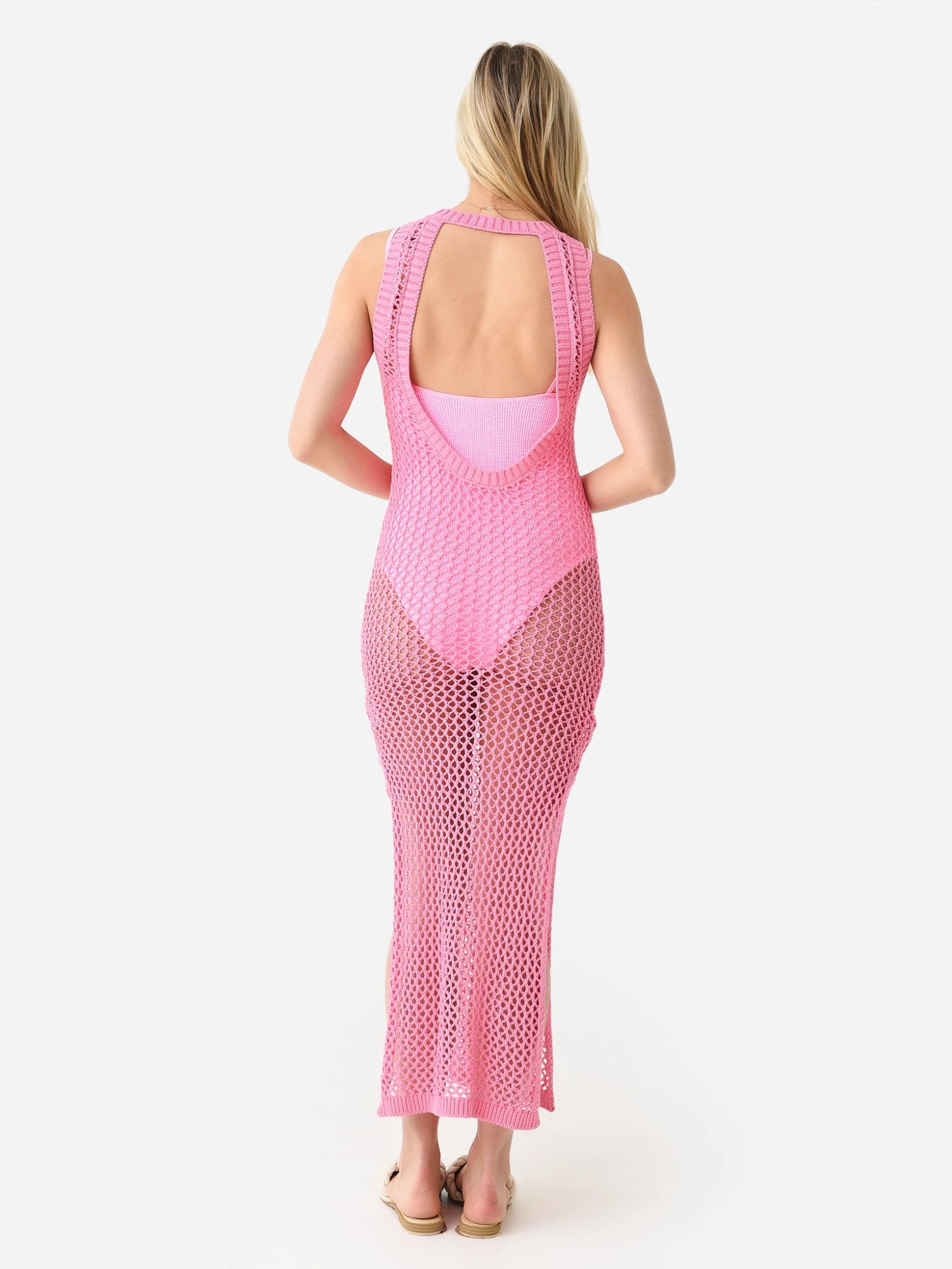 Open-back swim cover-up constructed from an open-knit crochet fabric.
