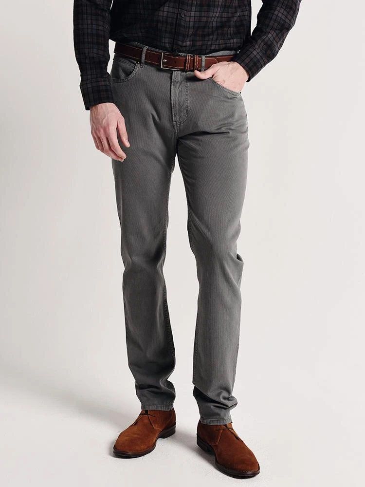 FEATURES:35 inseam; 14 leg opening; 11 front rise; 17 back rise (size 32)Zip fly with button closureFive-pocket style100% cottonMachine wash, tumble dryStyled with Billy Reid Shirt Style # 103-064 and Peter Millar Shoe Style # MF17F01. Model is wearing medium shirt and 32 jeans.