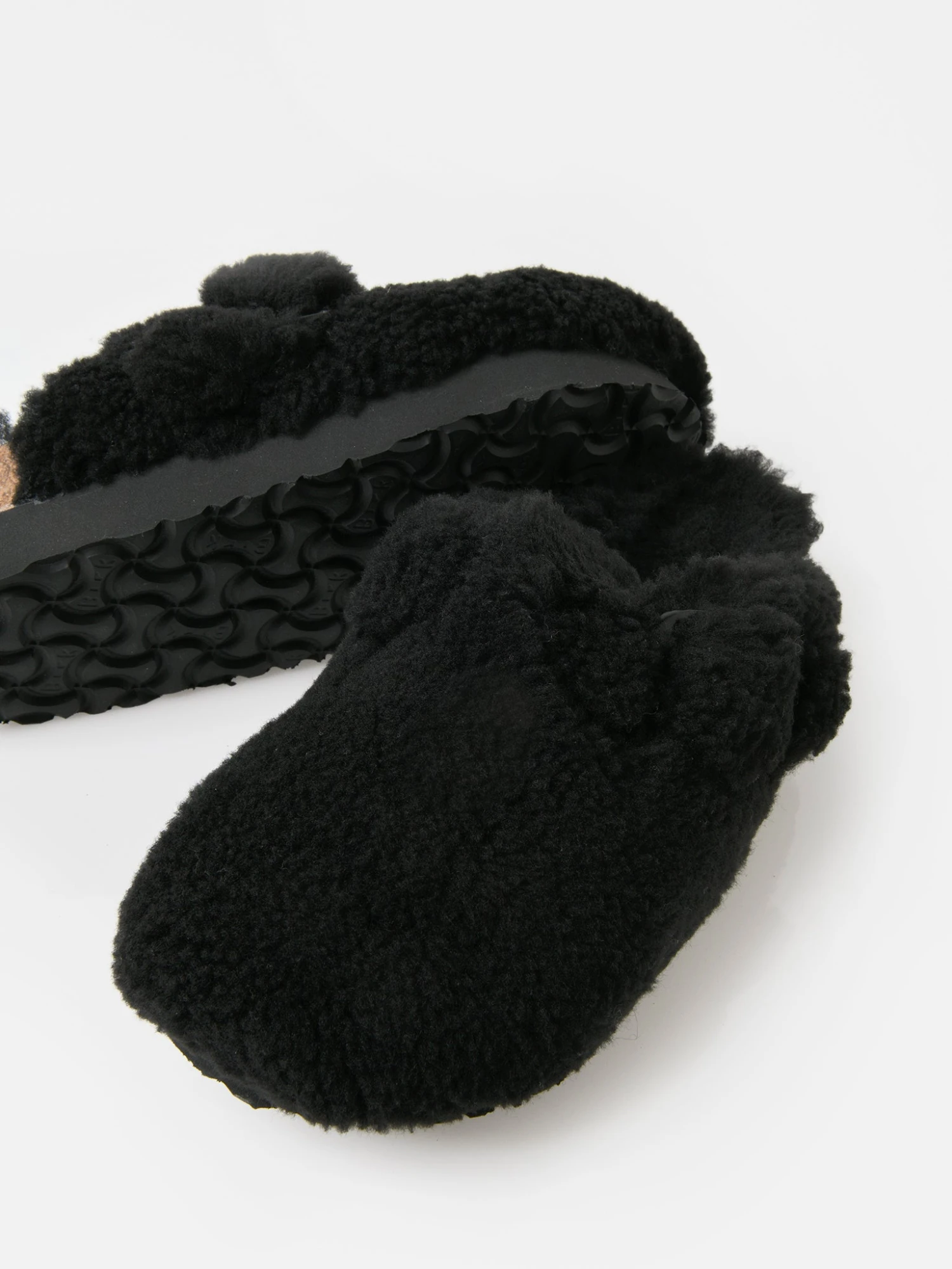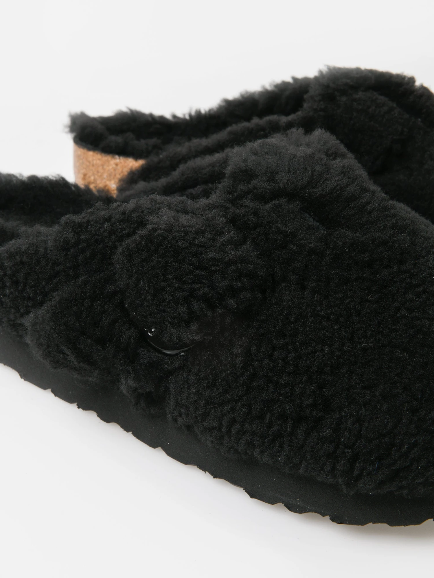 FEATURES:ClogRound ToeBig Buckle DetailAnatomically Shaped FootbedUpper: Shearling with Microfiber LiningFootbed Lining: ShearlingFootbed: CorkSole: EVAPlatform Heel Height: 0.98 in.