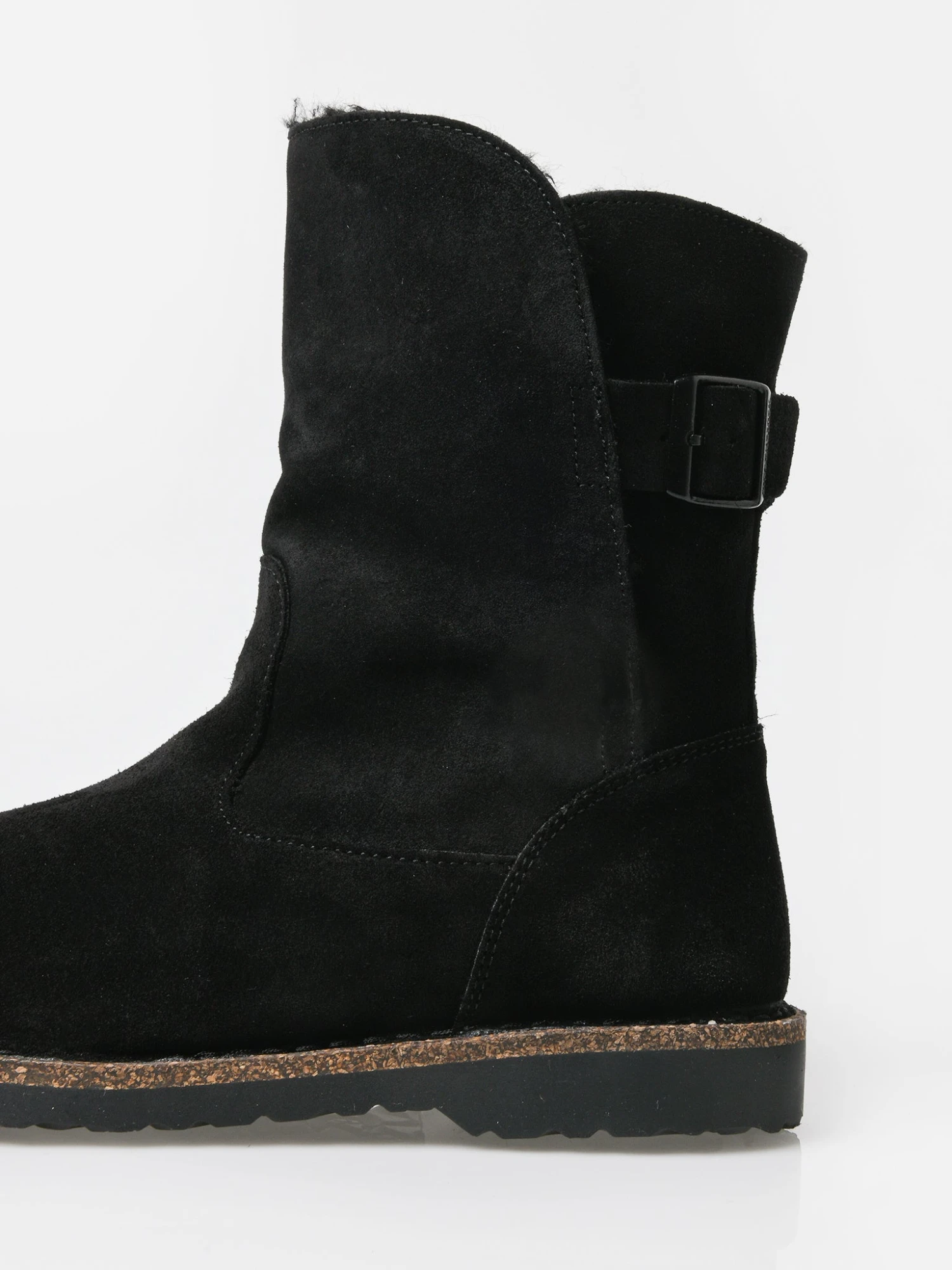 FEATURES:BootRound ToeMid-High LengthBuckle ClosureSuede UpperLining: ShearlingFootbed: Removable, Anatomically Shaped Cork-LatexSole: TR Rubber