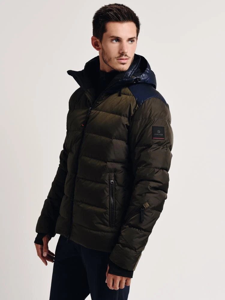 FEATURES:Down jacket in casual bomber stylePadded stand-up collar with soft knit trim insideDetachable hood with drawstringsTwo-way zipper with B logo and pull tabTwo zippered pockets on the front, one ski pass pocket on the sleeveContrasting zippersFIRE+ICE logo on the upper armHardware in matt blackLining in camouflage designOne zippered pocketSnow guard with rubberized finishWaistband with internal drawstringStyled with Bogner Frie + Ice Neal Pant Style # 3410-4282.
