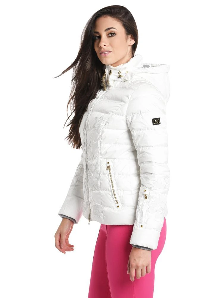 FEATURES:Removable drawstring hood, adjustable pocketBanded collar with snapsTwo way zipperLateral zipper pockets, sleeve lift pass zipper pocket, and interior zipper pocket Sleeves with striped embroidered cuffsSnow guardGold-colored metal detailsReflective floral embroideryWater column 20,000 mm, breathability 20,000 g/m²/24hLining: 100% polyesterFilling: 90% goose down, 10% goose feathersLength: 24.8 in 100% polyamideStyled with Bogner first layer Style # 5156-4144 and pant Style # 1171-4478. Model is wearing size 6 jacket, size small first layer and size 6 pant.