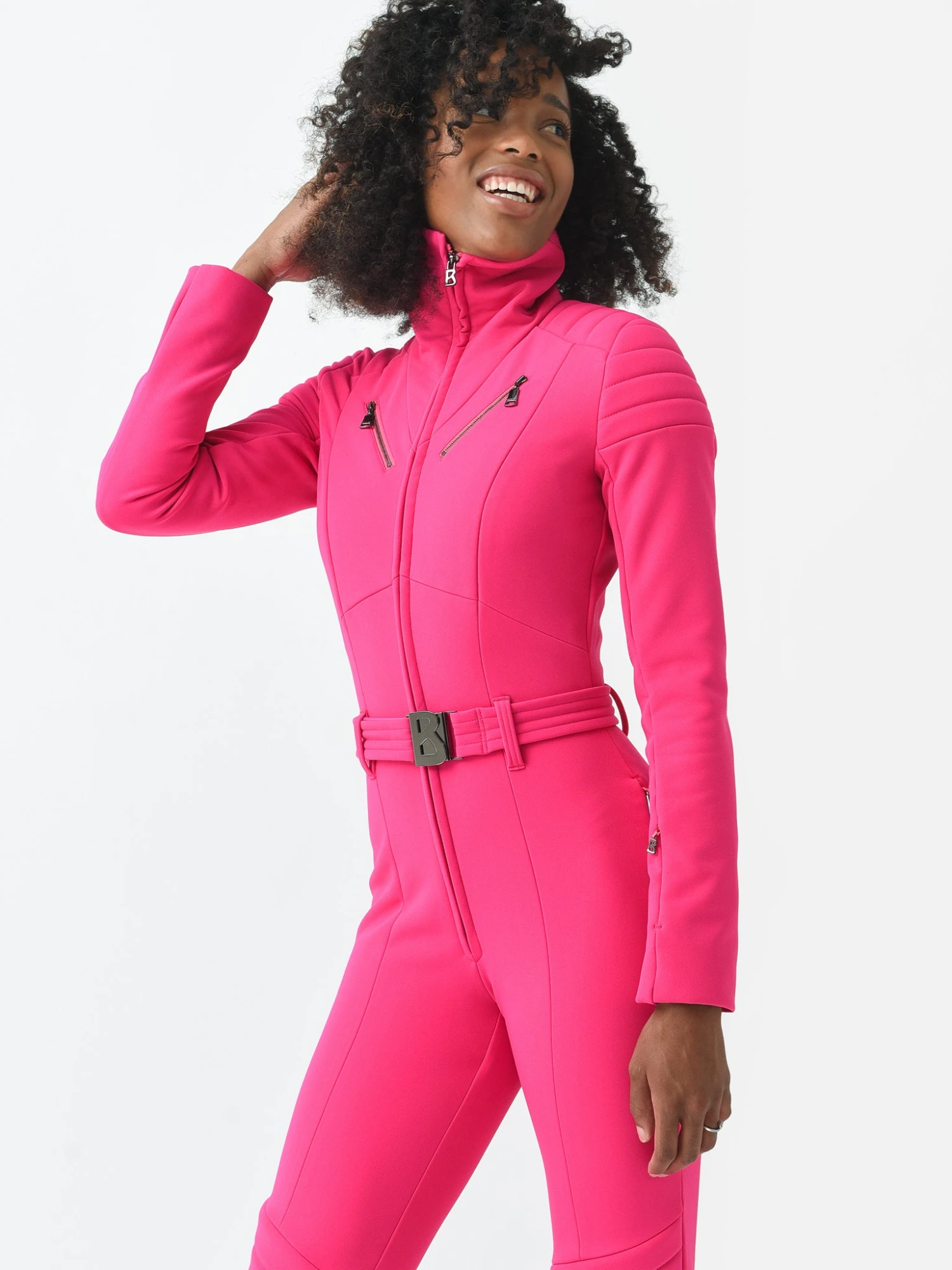 FEATURES:Ski SuitStand-Up CollarZip Chest PocketsLong Sleeve with a Zip Pass PocketFull Zip ClosureWaist BeltSide Zip PocketsPowder Cuffs with Gripper ElasticReinforced Shoulder, Elbows & KneesHem GussetsThree-Layer ConstructionShell: 89% Polyamide, 11% ElastaneSlim FitModel is wearing size 6 ski suit.Model’s Measurements: Height: 5’10” | Bust: 34B | Waist: 25.5″ | Hips: 36.5″ | Dress Size: 2 (US)
