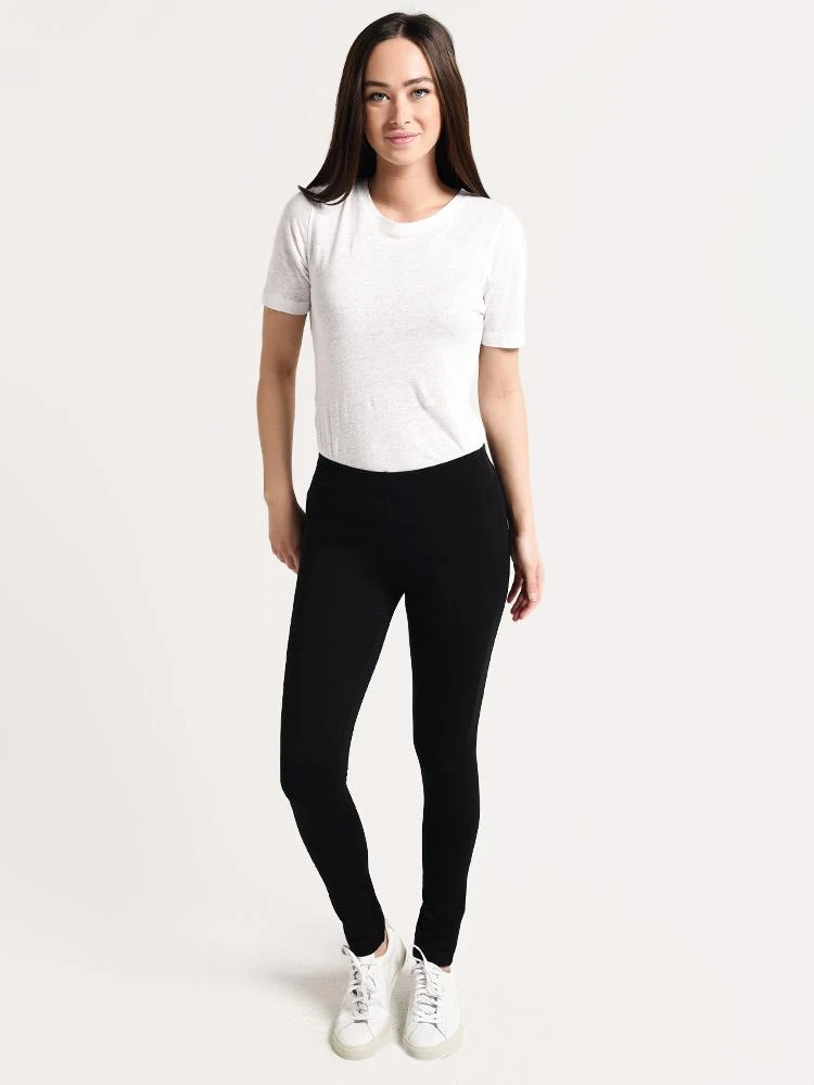 FEATURES:Elastic waistband Fitted leg 65% rayon, 30% polyester, 5% spandex Imported Styled with Brochu Walker tee Style # LVK2761 and Veja sneakers Style # EA2001W. Model is wearing size small pant and tee.