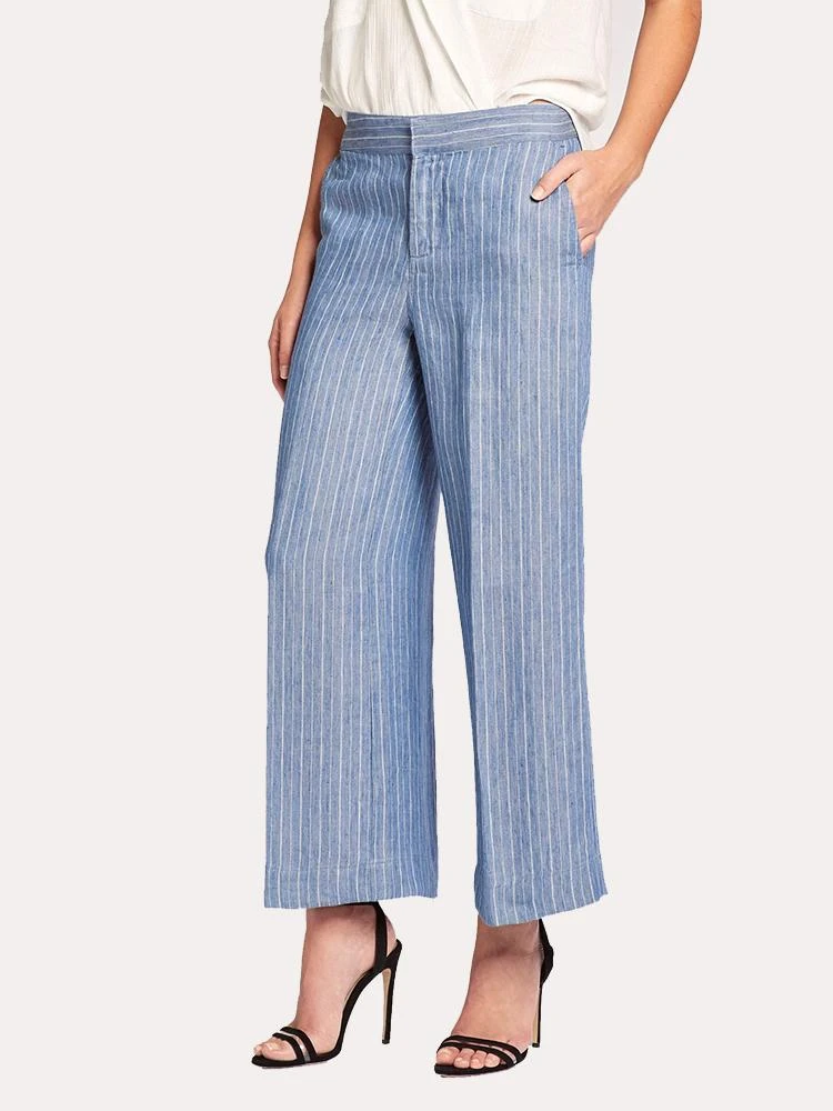 FEATURES:Chambray PantCropped CutWide Leg DesignSubtle Stripe PrintFlat FrontElasticated WaistHook and Button with Zip-Fly ClosureSide Seam Pockets, Single Back Welt Pocket100% Linen
