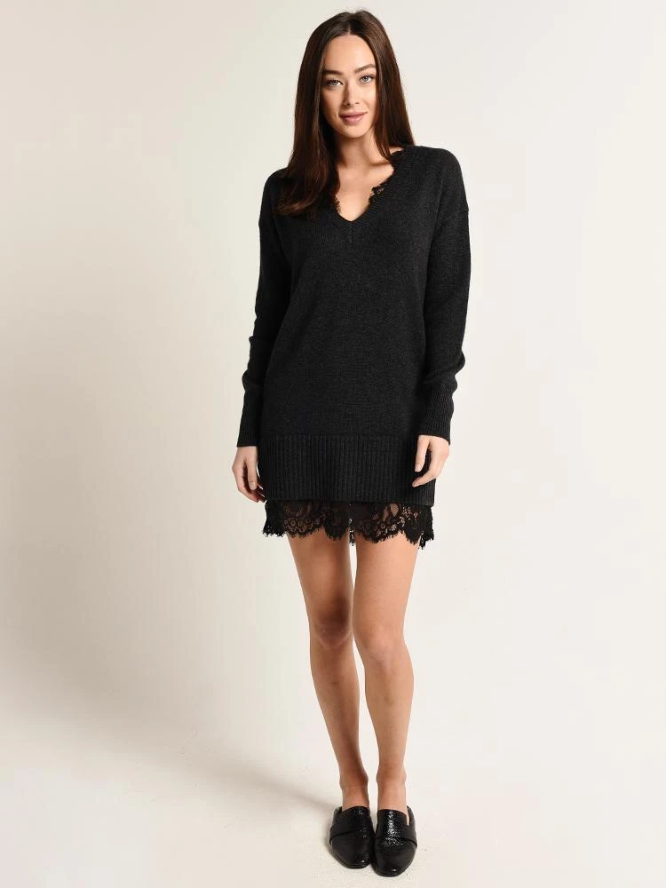 FEATURES:70% Wool 30% Cashmere V Neck with Lace Trim Long Sleeve ImportedModel is wearing size small dress.