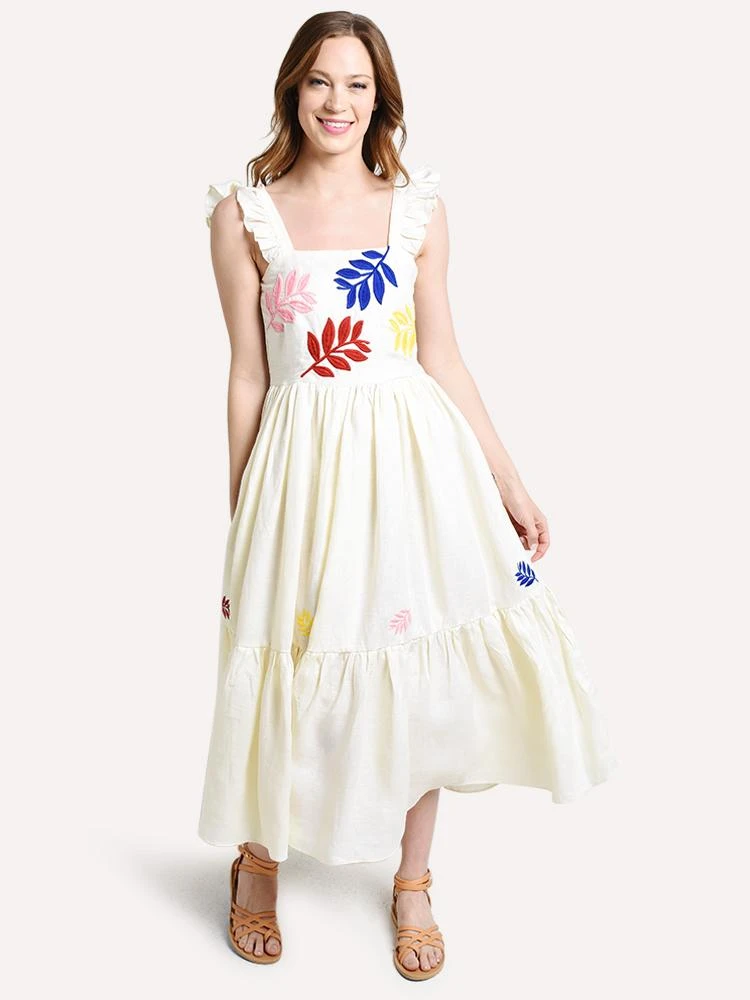 FEATURES:Sqaure neckline Ruffle detail on strap Fits at natural waist Flounce hemline Embroidered details Side zipper closure 100% linen Dry clean only Styled with Valia Gabriel sandals Style # VG-0046. Model is wearing size small dress.