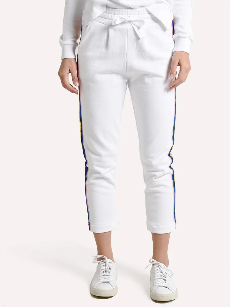 FEATURES:Elastic waistband Front slant pocketsSlim fit Striped trim detail down legCropped leg 100% cotton Machine wash Styled with Chinti and Parker top Style # TN06 and Veja sneakers Style # EA2001W. Model is wearing size small top and bottom.