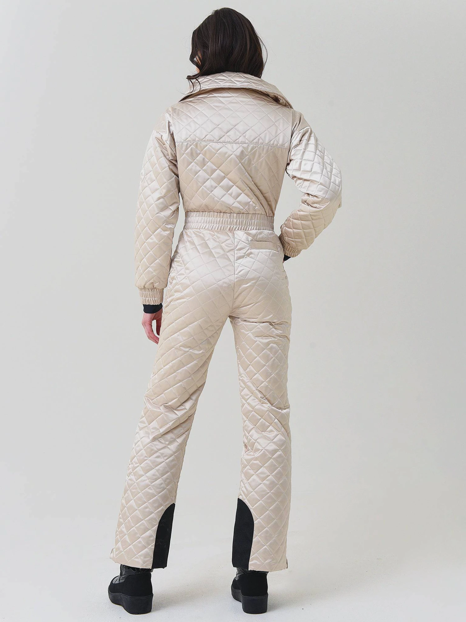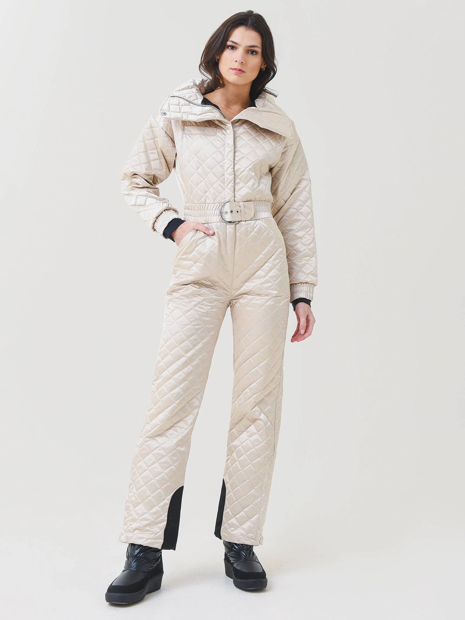 FEATURES:Ski SuitLarge Stand-Up CollarLong Sleeve w/ Elastic CuffsElastic Waistband w/ BuckleSide PocketsInterior PocketBootcut SilhouetteQuilted Satin-Finish Water-Repellent FabricationShell: 100% Polyamide | Lining: 100% Recycled PolyesterClassic FitModel is wearing size Small ski suit.Model’s Measurements: Height: 5’9.5″ | Bust: 34A | Waist: 26.5″ | Hips: 37″ | Dress Size: 2-4 (US)