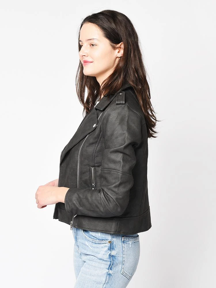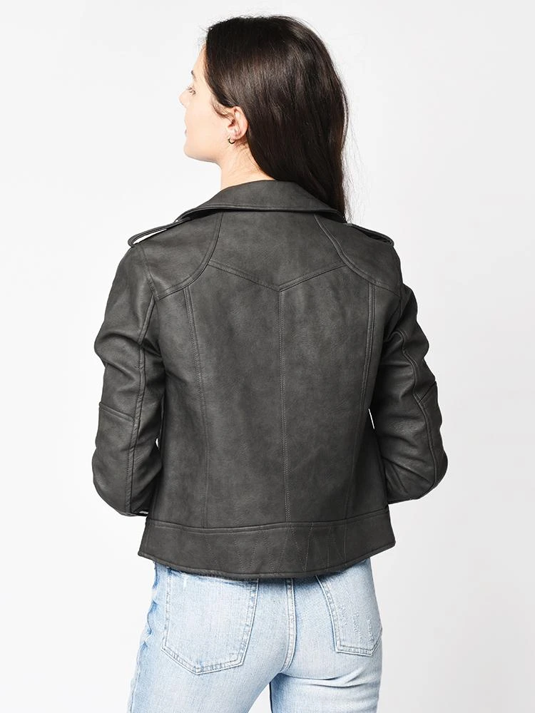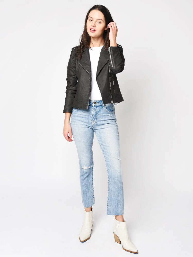 FEATURES:Asymmetrical zip closure Notched lapels Zip cuffs Zip hand pockets Lined 100% polyurethane Imported Styled with Citizens of Humanity tee Style # 9119-1034, Pistola jeans Style # P6087CSF-ILL and San Edelman boots Style # F11494L102. Model is wearing size small jacket, size small tee amd size 26 jean.