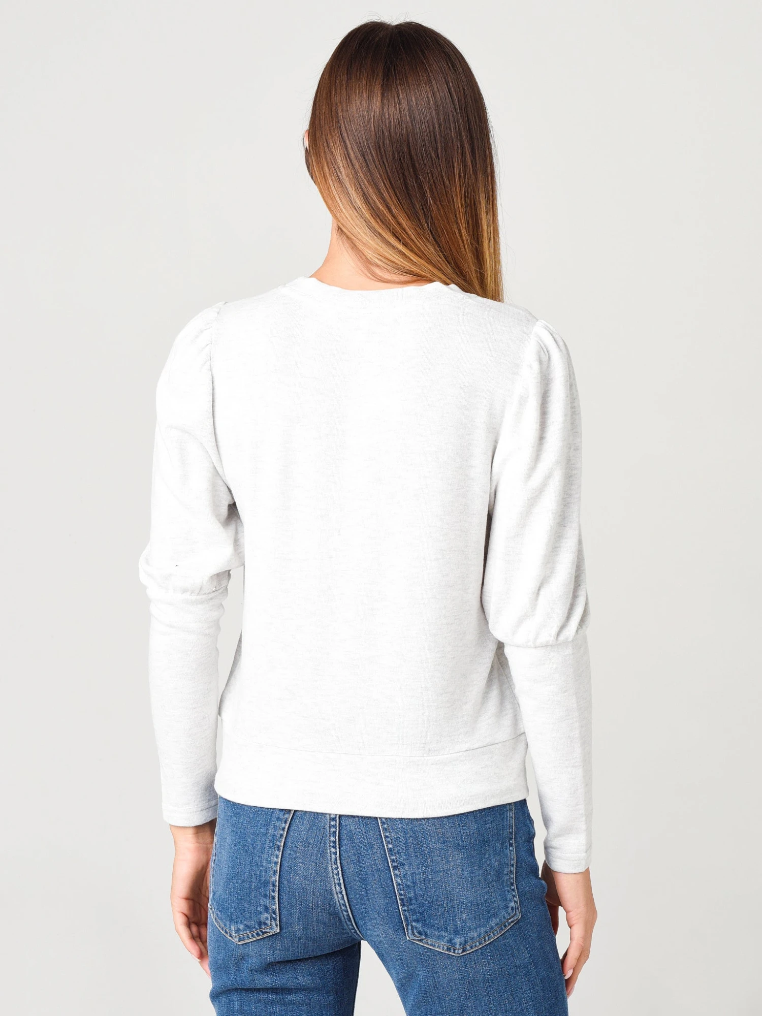 FEATURES:Pullover SweaterCrew NecklineLong, Puff SleeveBanded Collar and HemHeathered StylingLightweight62% Polyester, 33% Rayon, 5% ElastaneModel is wearing size Small sweater.Model’s Measurements: Height: 5’9″; Bust: 32C; Waist: 24.5″; Hips: 36″; Dress Size: 2 (US)