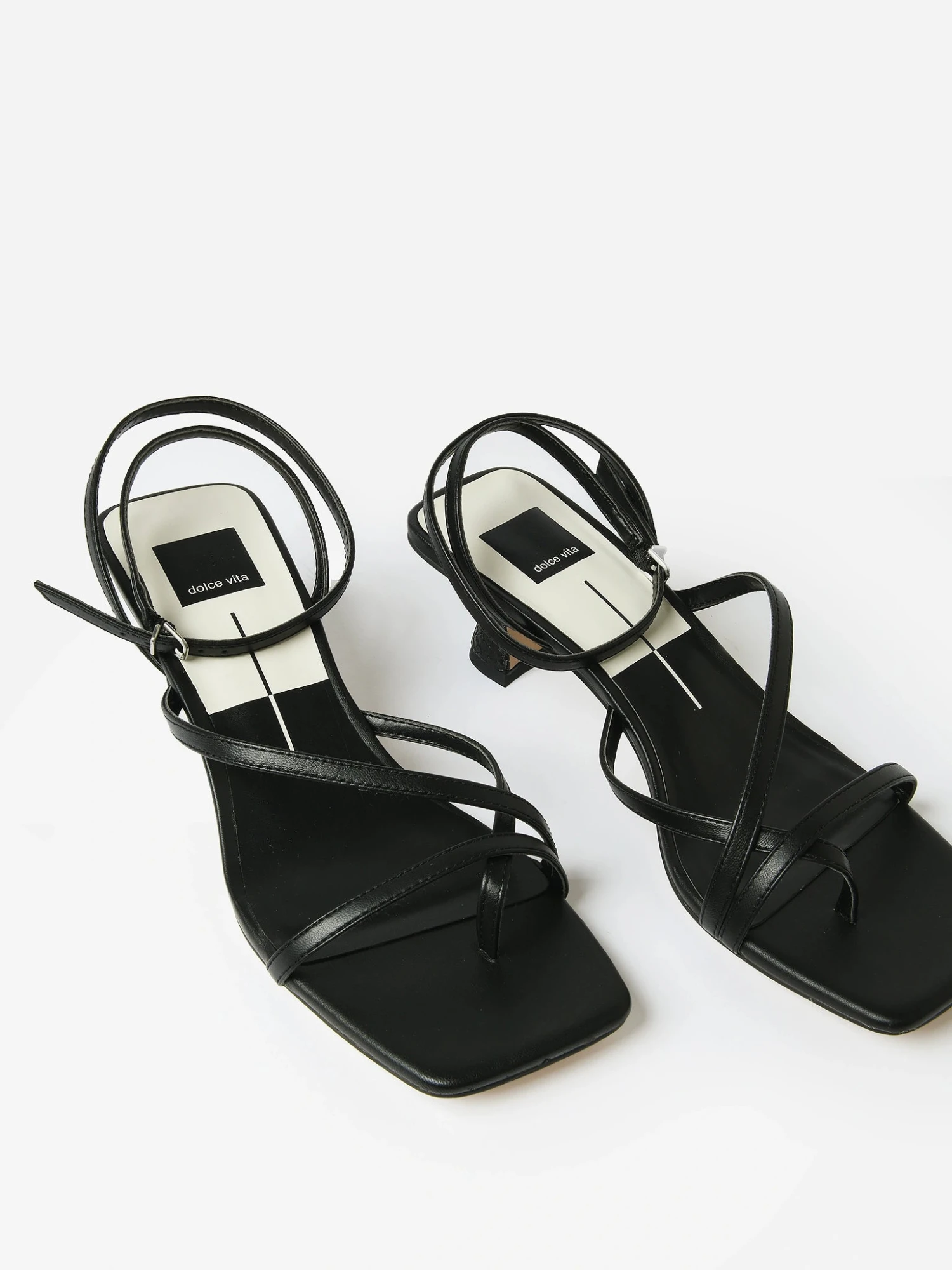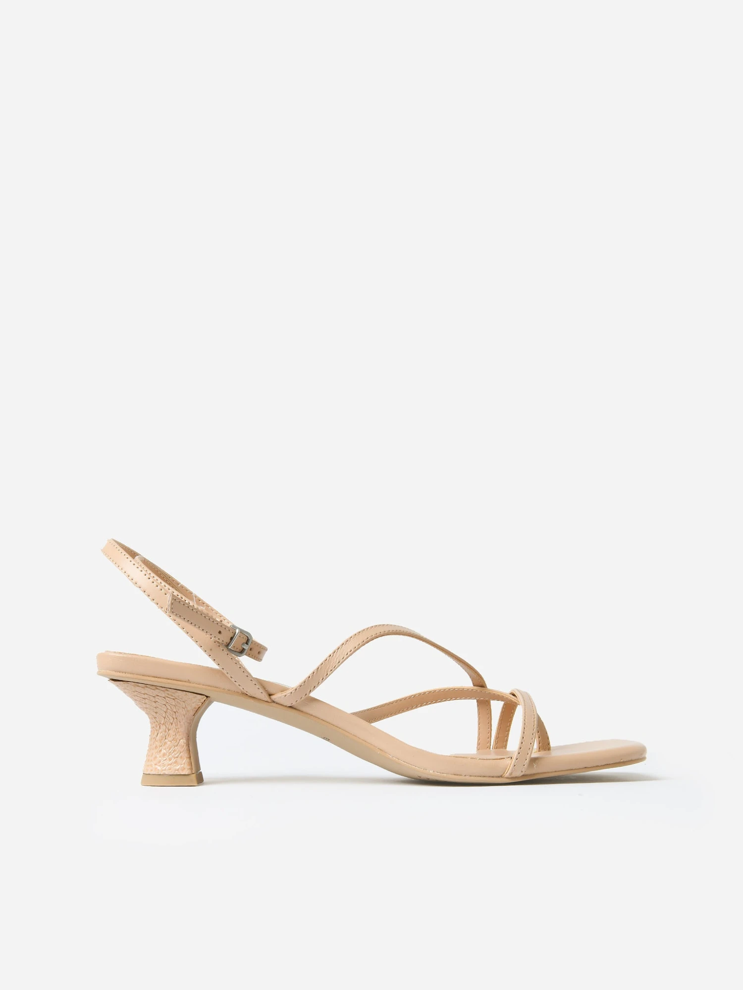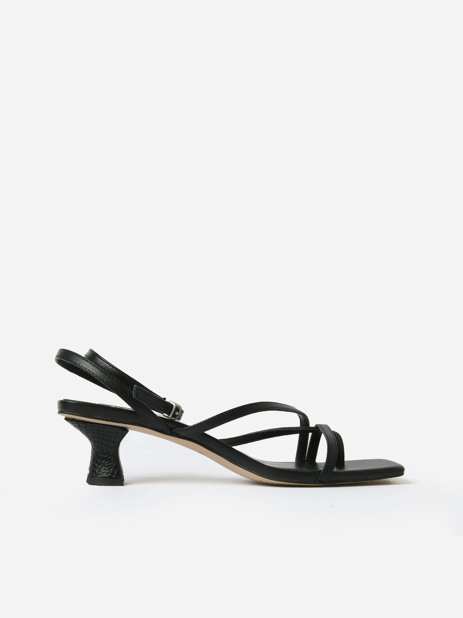 Leather sandal with alluring skinny straps and a sculpted tapered heel.