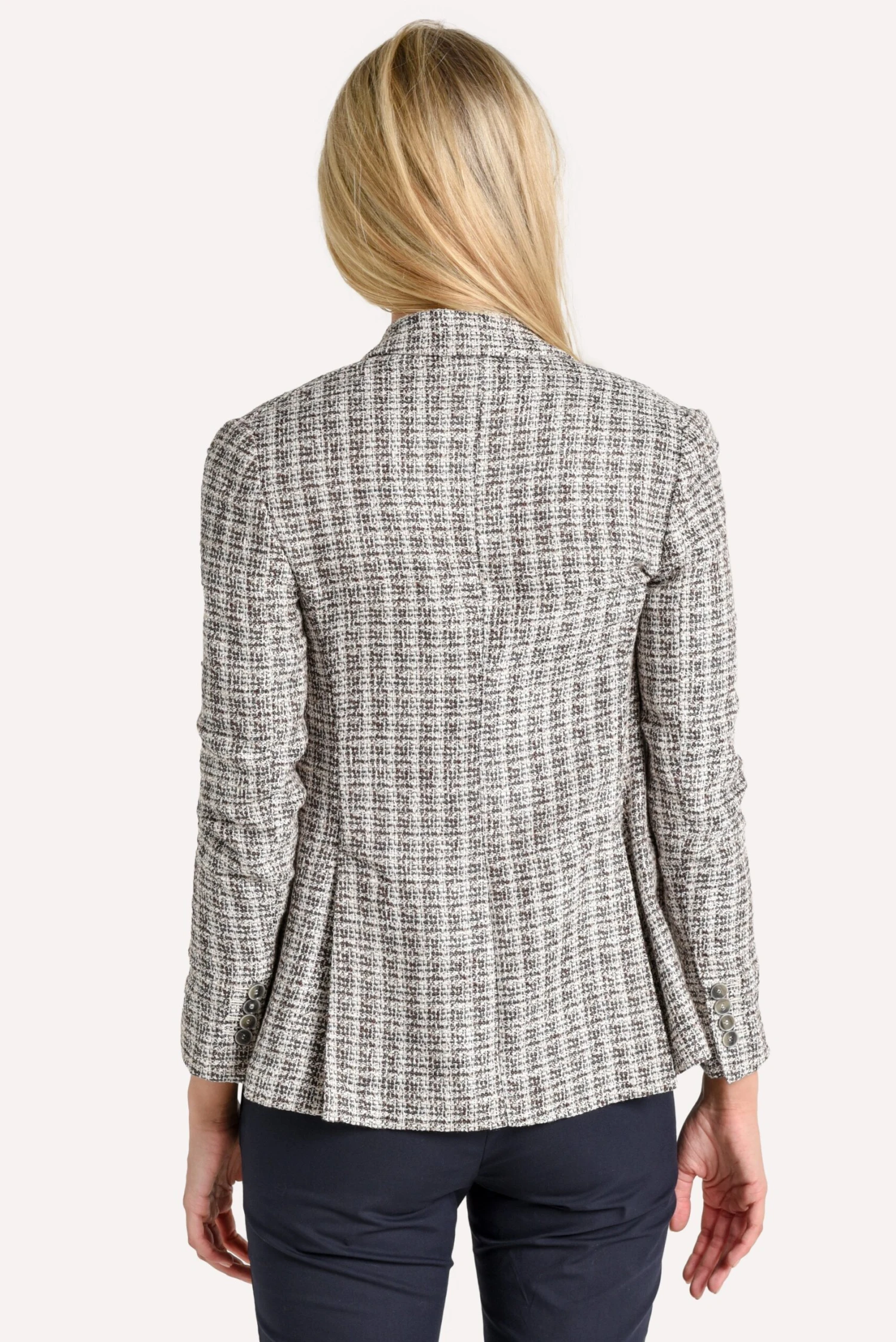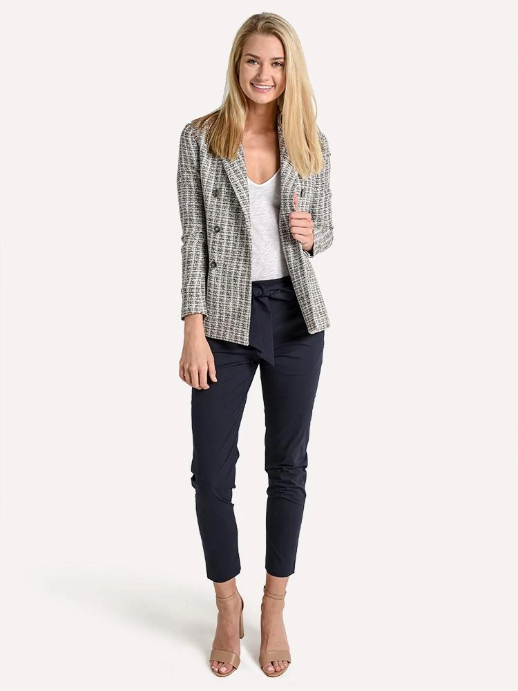 FEATURES:Double-breasted modelPeak lapelsWelt pocketFlap pocketsDouble back cutHalf-liningLurex detailsComposition: Cotton: 71%, Polyamide: 21%, Metal 7%, Elastane 1%Model is wearing size 0 jacket. Style with Stateside Spaghetti Strap Cami style # 04-2310 and Eleventy New York Pants style # 980PA0090 PAN27054.