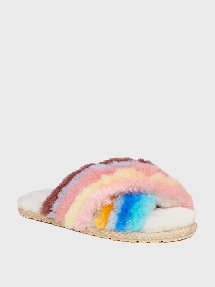 FEATURES:Slippers, SlidesCrossover Strap DesignSlide WearabilityUppers: 100% Australian SheepskinLining: 100% Australian SheepskinFootbed: 100% Australian SheepskinOutsole: Durable and Flexible TPRMulticolor, Rainbow DesignFluffy and Ultra-CozyBreathableWoolmark Accredited