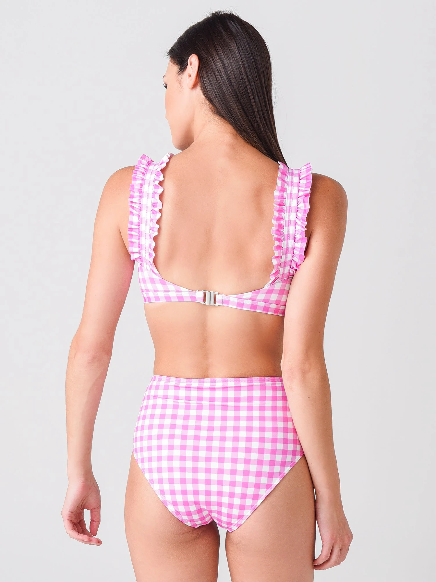 FEATURES:Tank Bandeau Style Bikini TopSquare NecklineThick, Ruffle StrapsBack Clasp ClosureAll-Over Gingham PlaidFully LinedClassic Fit80% Recycled Polyester, 20% ElastaneModel is wearing size 38 (S) bikini top.Model’s Measurements: Height: 5’9.5″; Bust: 34A; Waist: 26.5″; Hips: 37″; Dress Size: 2-4 (US)