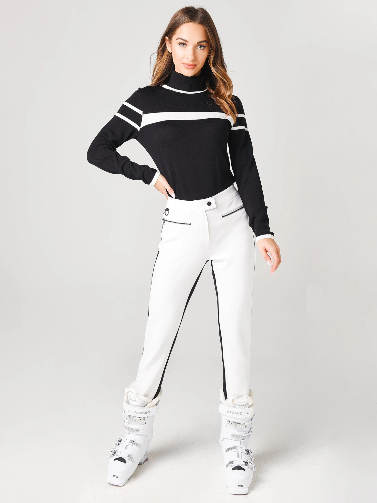 FEATURES:Pullover SweaterFold-Over Turtleneck CollarExtra-Fine Merino Wool FabricationWater-RepellentNon-Bulky, Non-ItchyBreathableMoisture Wicking and Quick-DryStripe Pattern100% Extrafine Merino WoolModel is wearing size small sweater and size 4 pants. Model’s Measurements: Height: 5’9″; Bust: 32C; Waist: 24.5″; Hips: 36″; Dress Size: 2 (US)