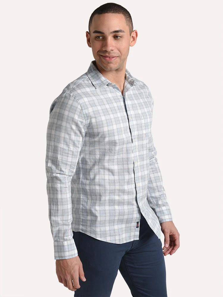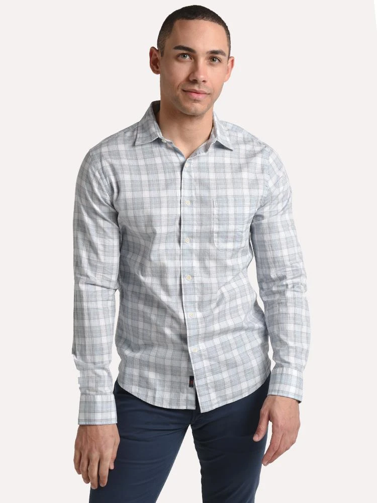 FEATURES:Spread collarLong sleeves with single barrel rounded cuffsFront placketChest patch pocketCheckered printTopstitching throughout Curved shirttailTrim fitStyled with AG Jeans Style # 1174SUD. Model is wearing size medium shirt and 32 pant.