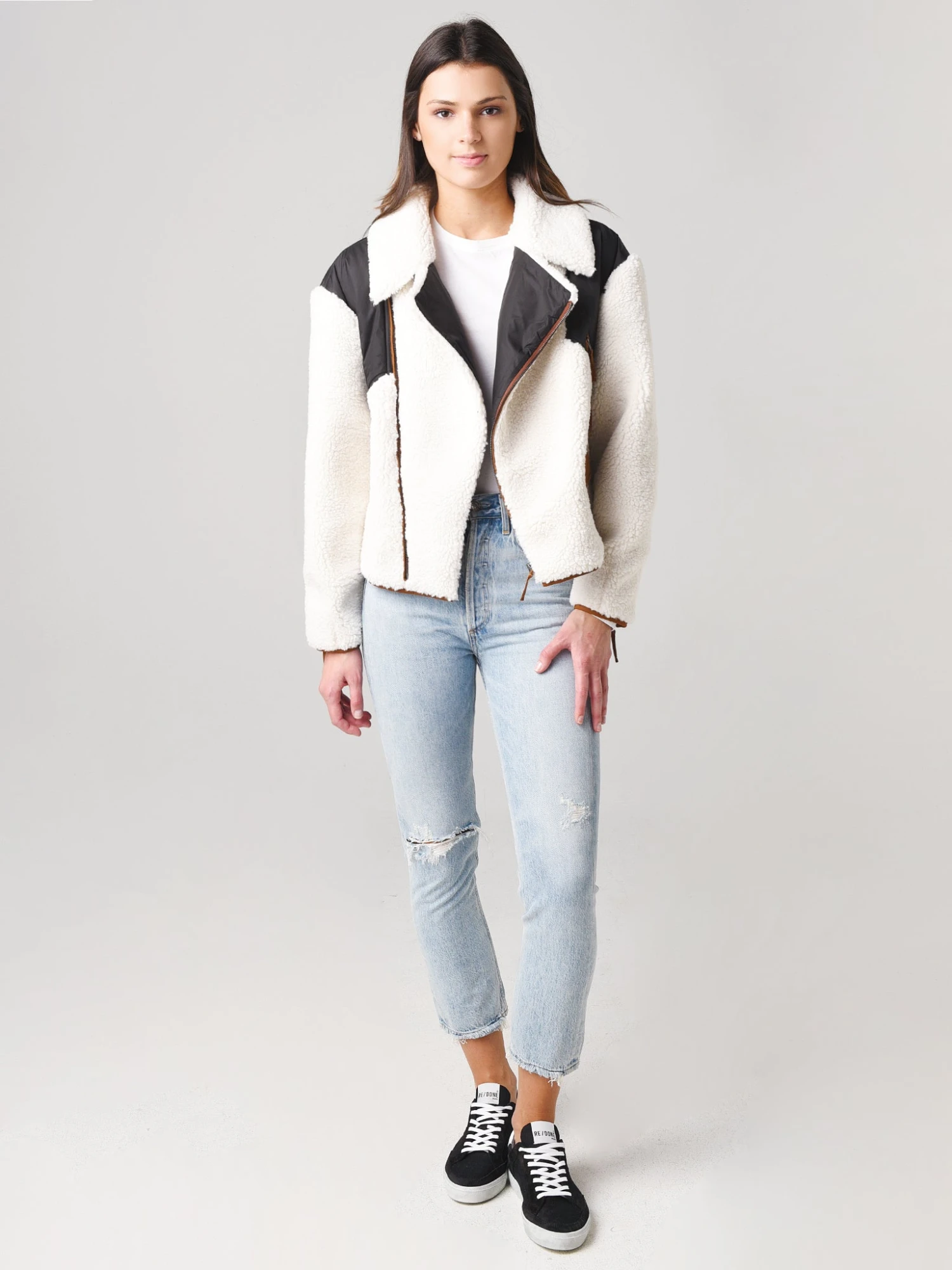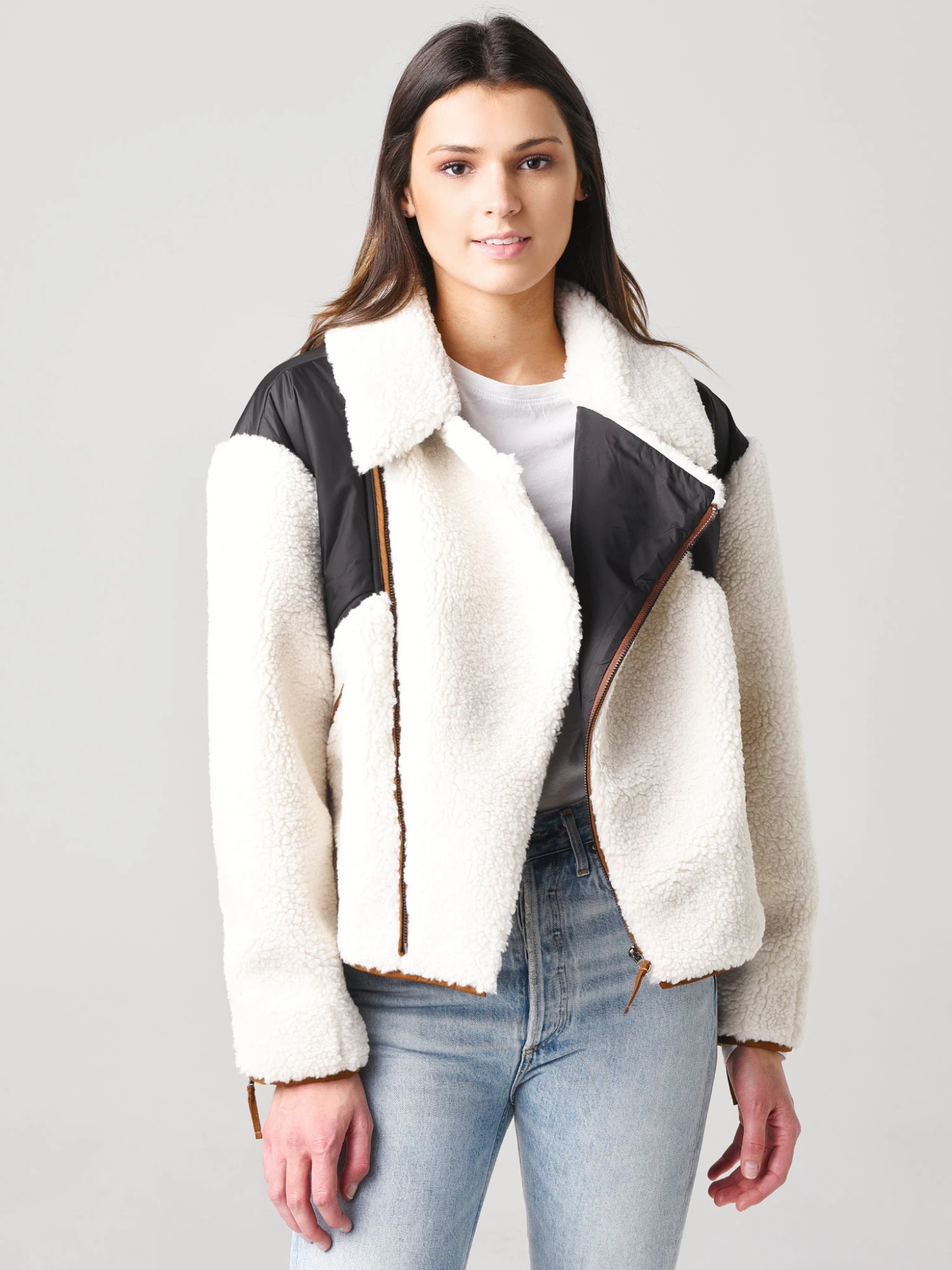 The fabric mix and a two-toned palette put a modern spin on the supremely cozy Frame Women’s Fleece Mix Jacket.