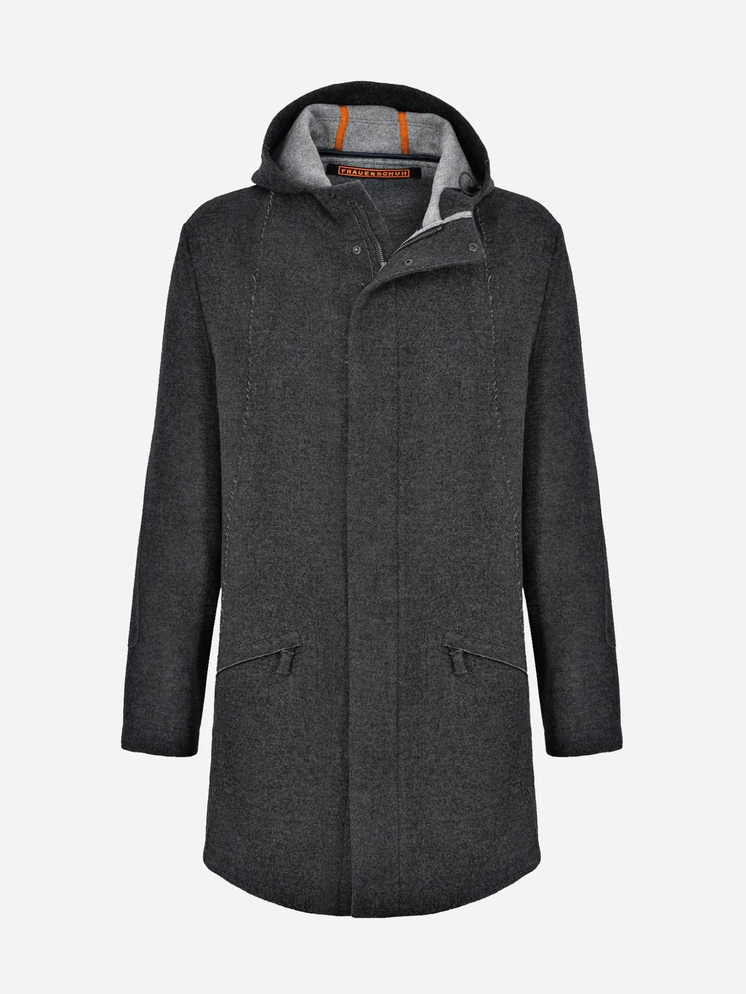 FEATURES:CoatHigh Neckline with HoodReinforced ShouldersLong Sleeve with Reinforced Elbow PatchesSide Zip PocketsZip Closure with Button PlacketStraight HemLong SilhouetteOpen-Edge Details100% WoolRelaxed Fit