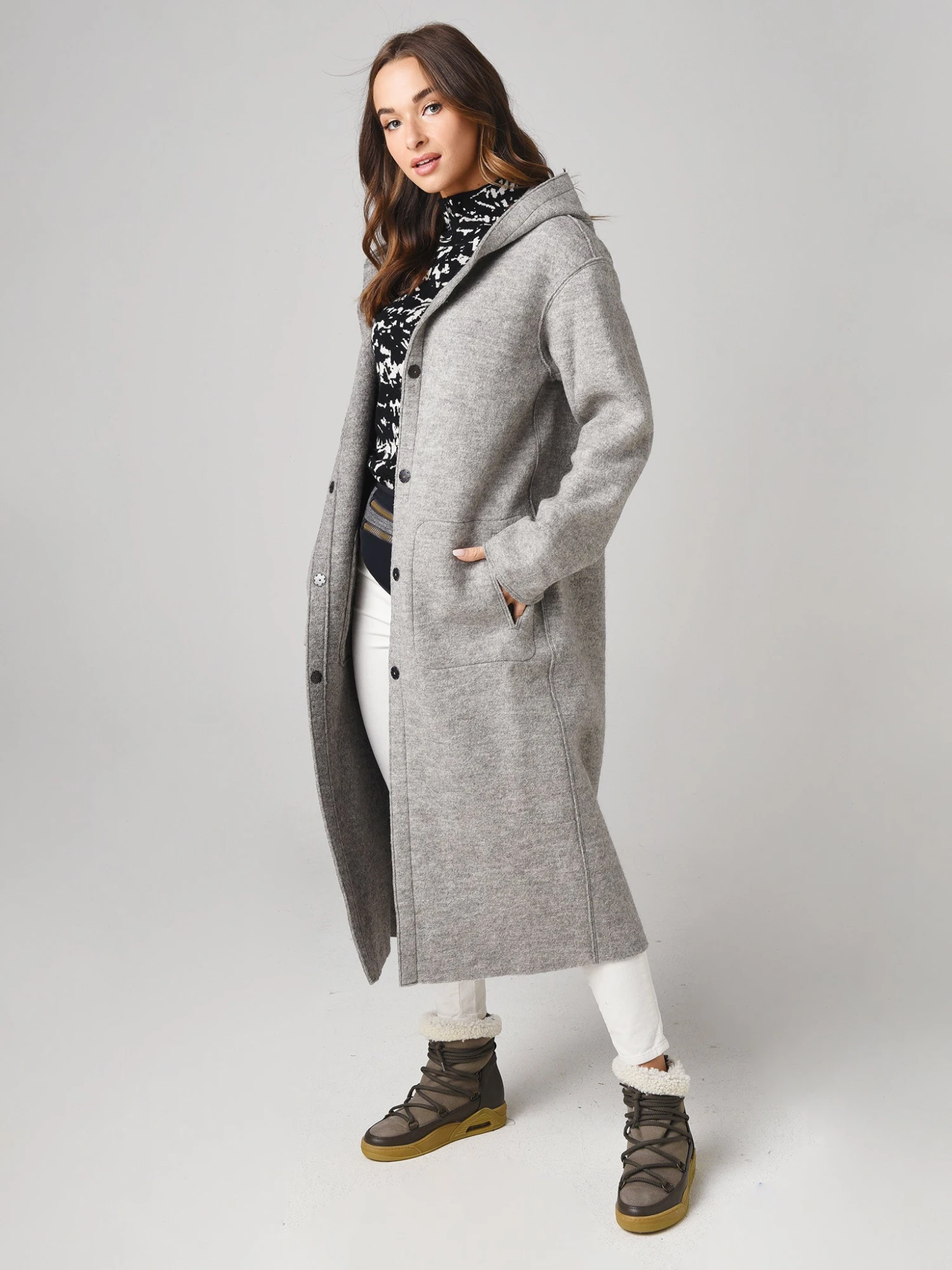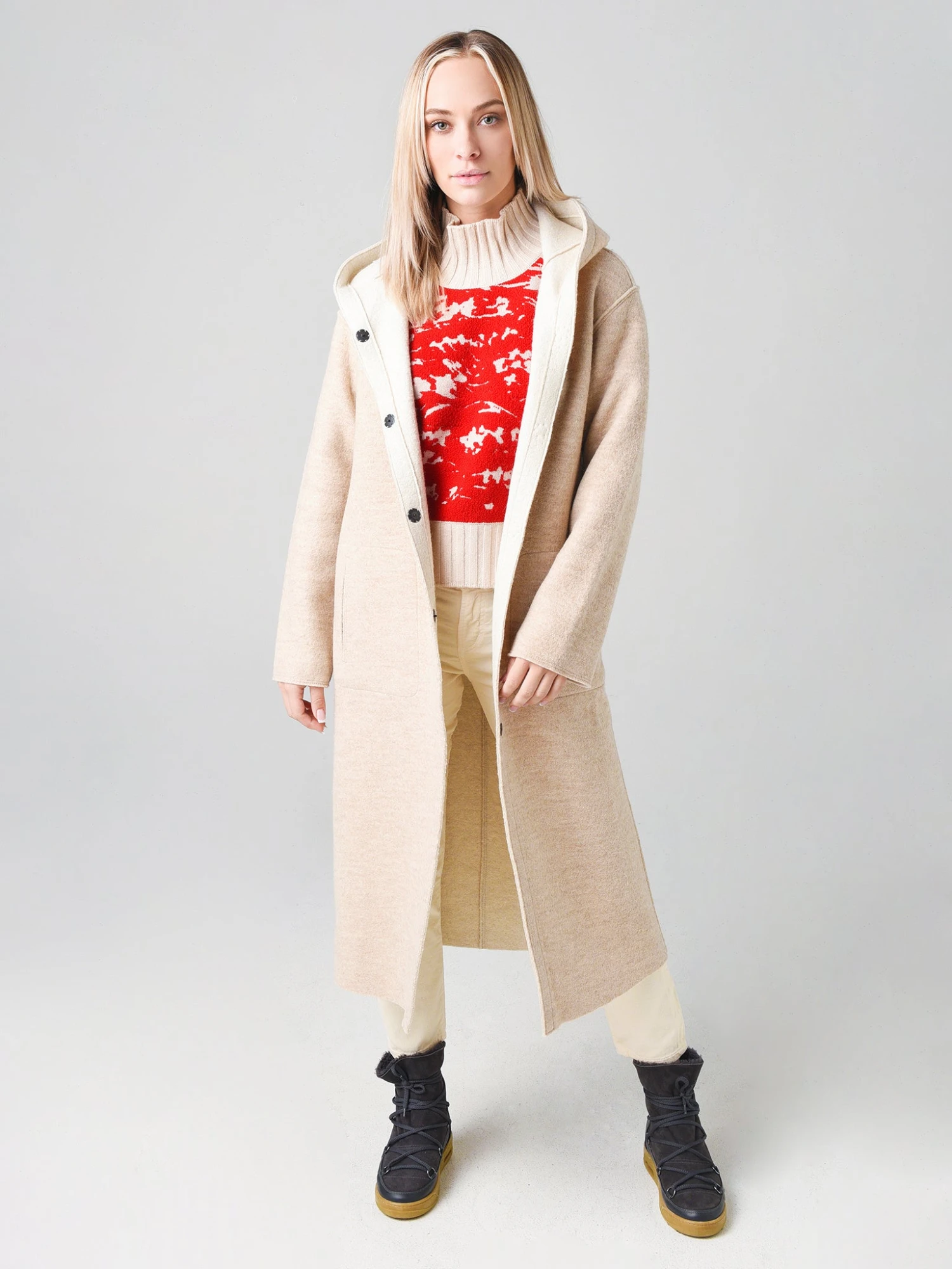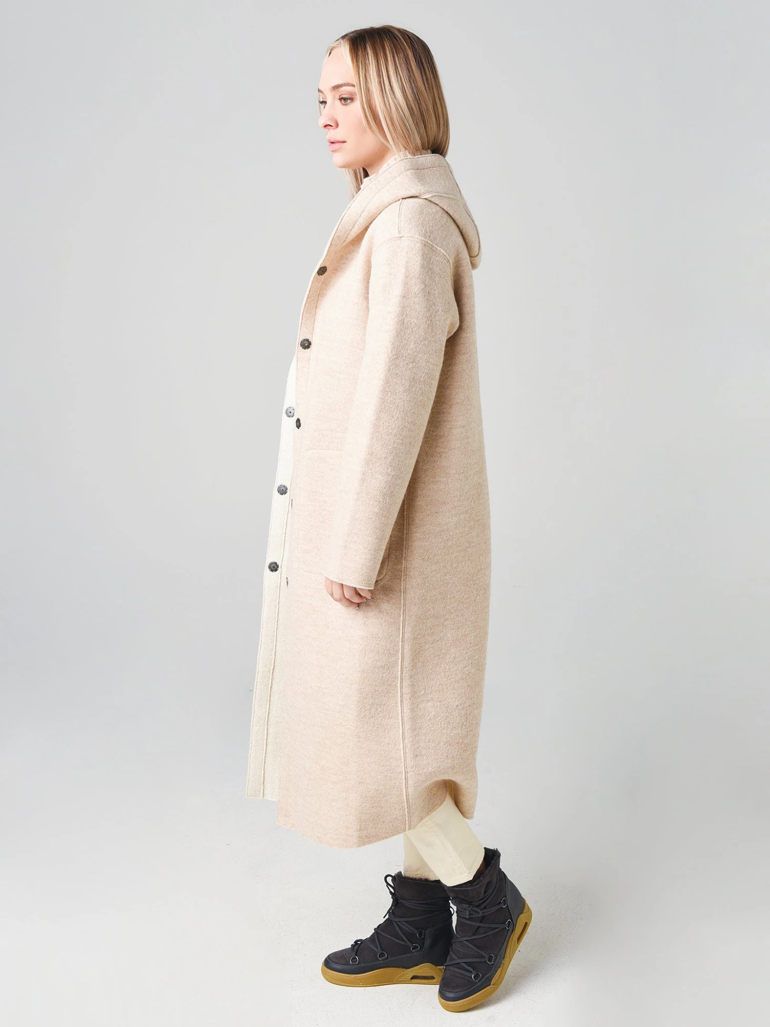 FEATURES:Long CoatAttached HoodSingle Breasted, 4-Button Snap ClosureHard-Wearing, Dirt-repellent and Crease-FreeSide PocketsOpen-Edge Seam ProcessingFully ReversibleMid-WeightBreathableSuper Warm70% Merino Wool, 30% Alpaca FineModel is wearing size 1 coat.Model’s Measurements: Height: 5’9″; Bust: 32B; Waist: 25.5″; Hips: 36.5″; Dress Size: 4 (US)