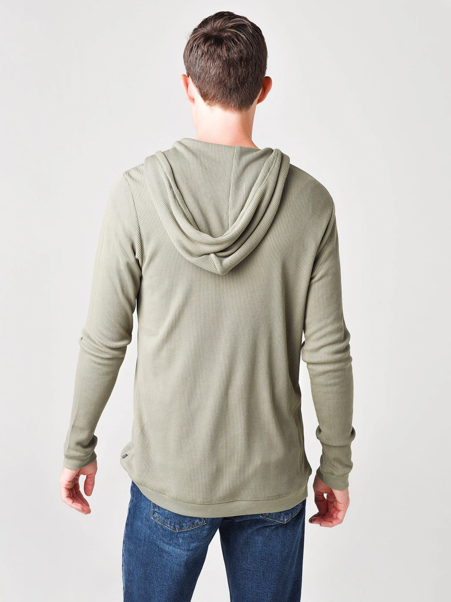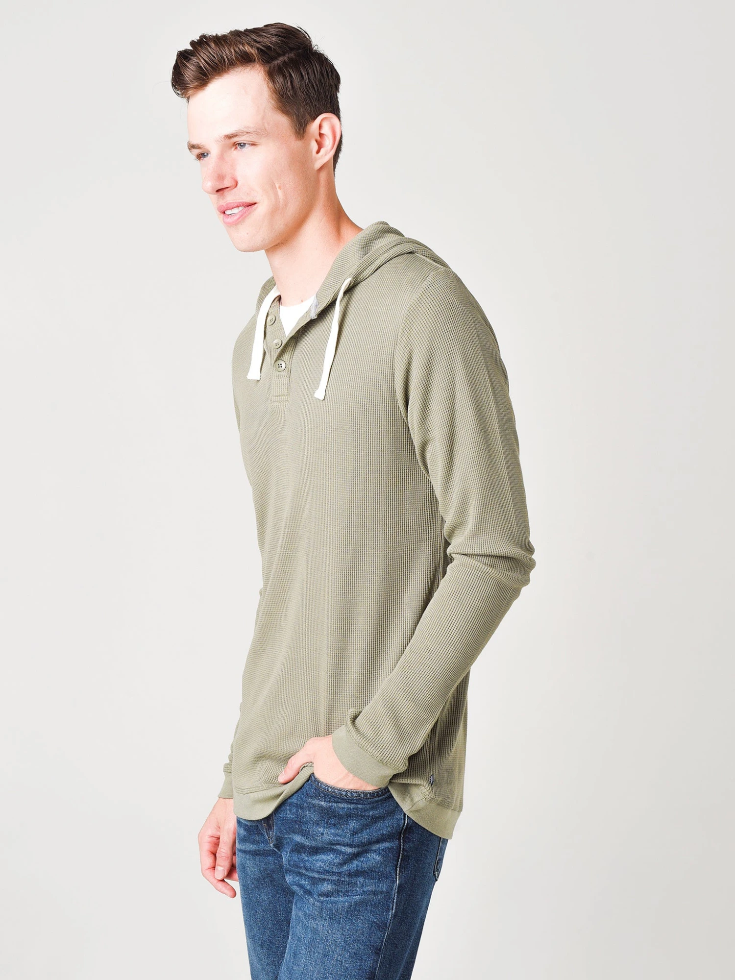 FEATURES:HoodieHooded Neckline with DrawstringHenley 3-Button Placket with Contrast DetailLong SleeveTextured Waffle Knit FabricationLight WarmthRegular FitSelf: 70% Viscose from Bamboo, 30% PolyesterModel is wearing size medium hoody.Model’s Measurements: Height: 6’2″; Waist: 30″; Inseam: 34″; Collar: 15.5″; Sleeve: 36″