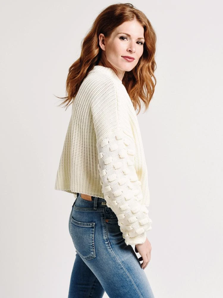 The GLAM Bubble Sleeve Rib Knit Sweater is a season favorite to pair with high rise jeans.