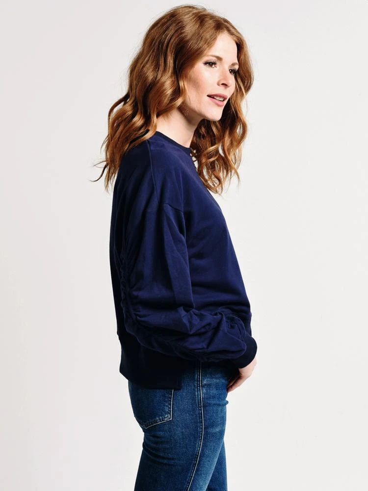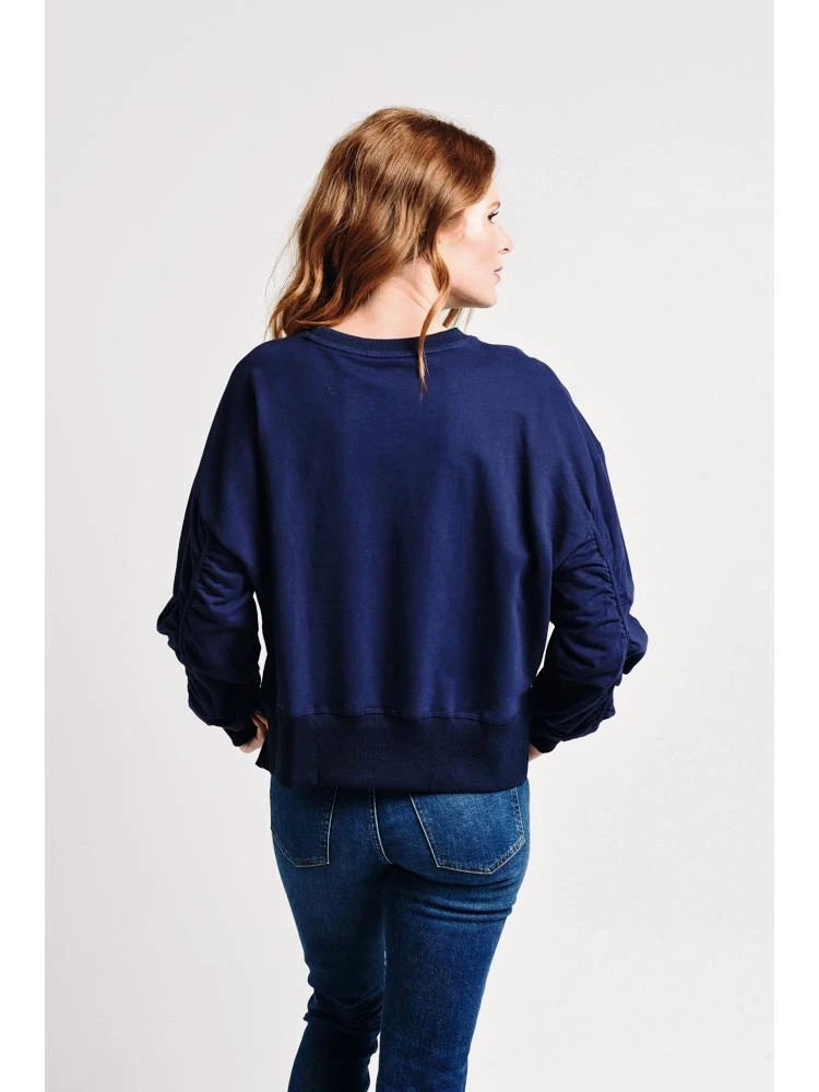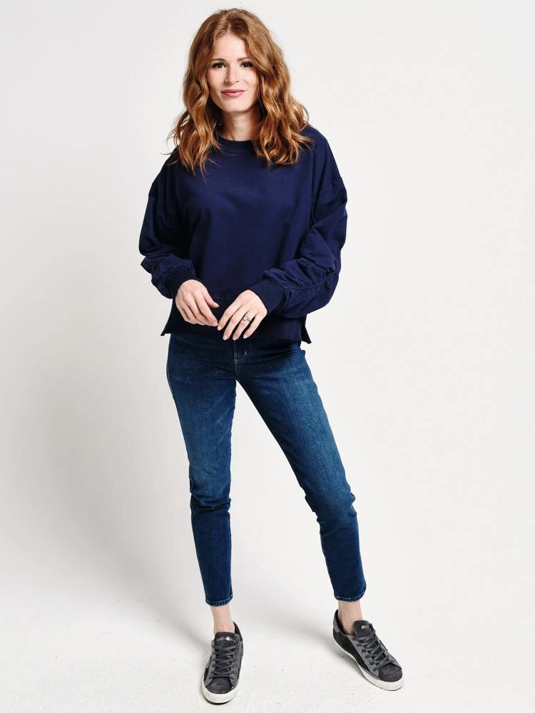 FEATURES:Crew neck Ruching detail on sleeveRibbed trim at neck, cuff and hem 100% cotton Imported Styled with Agolde jeans Style # A051B-812 and Philippe Model sneakers Style # CLLD-XY04. Model is wearing size small top and size 26 jean.