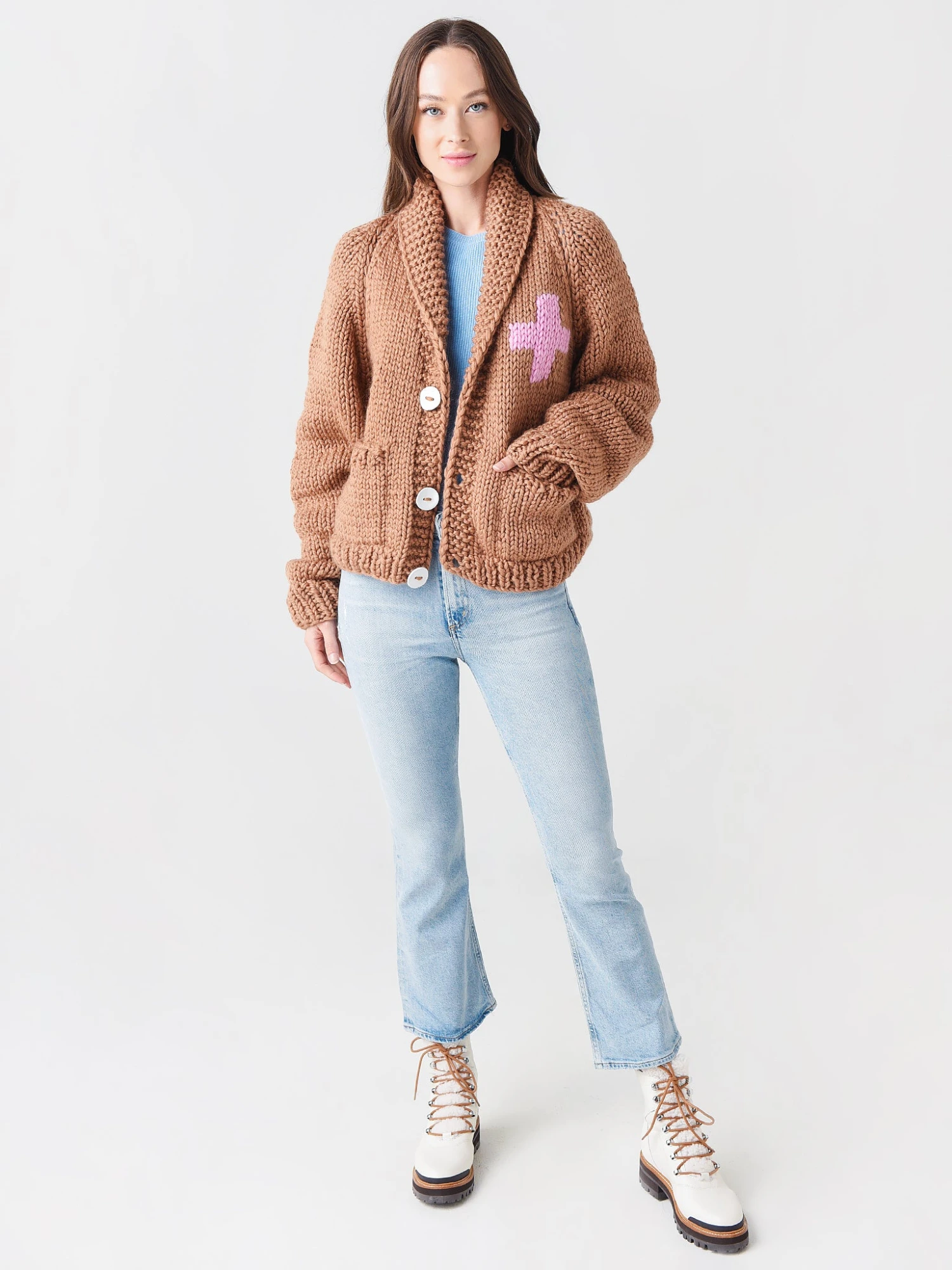FEATURES:CardiganShawl CollarKnit Cross Motif on Left Chest3-Button FrontHand Painted Clay ButtonsSlouchy Front PocketsCross + Snow Babe Knit Motif on BackRibbed Cuffs and HemHand Knitted FabricationUltra Soft100% Italian Spun WoolRelaxed FitWidth: 24 in. | Length: 22 in. | Arms: 32 in.Model is wearing size O/S sweater.Model’s Measurements: Height: 5’10.5″ | Bust: 32C | Waist: 25″ | Hips: 36″ | Dress Size: 4 (US)