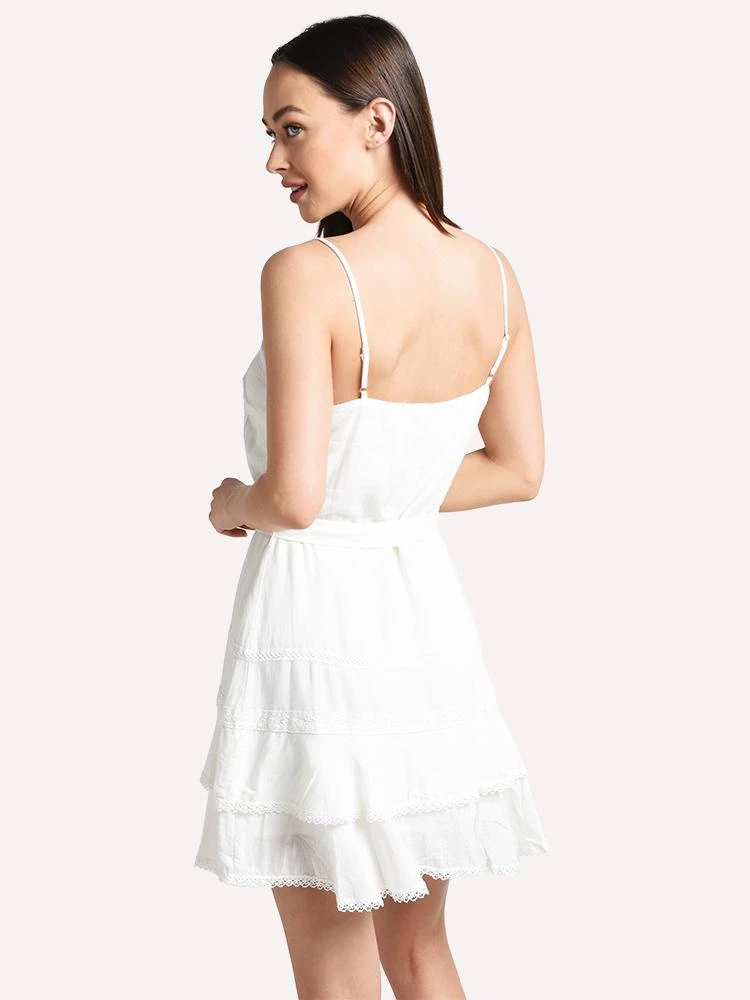 FEATURES:V-neckline Button down placket Self tie waist Doubled layered hem Lace trim at hem Adjustable straps 70% rayon, 30% linen Imported Styled with Soludos sandals Style # 1000341. Model is wearing size small dress.
