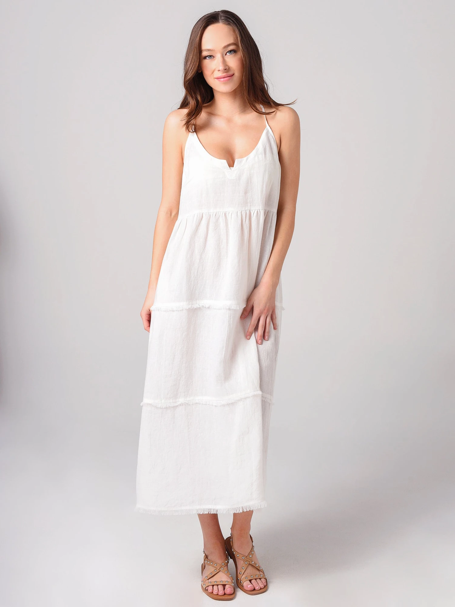 FEATURES:Cover-Up DressScoop Neckline, Split DetailVoluminous, Tiered Skirt StylingFray Trim DetailOversized On-Seam PocketsLoose Silhouette100% LinenModel is wearing size Small cover-up dress.Model’s Measurements: Height: 5’10.5″; Bust: 32C; Waist: 25″; Hips: 36″; Dress Size: 4 (US)
