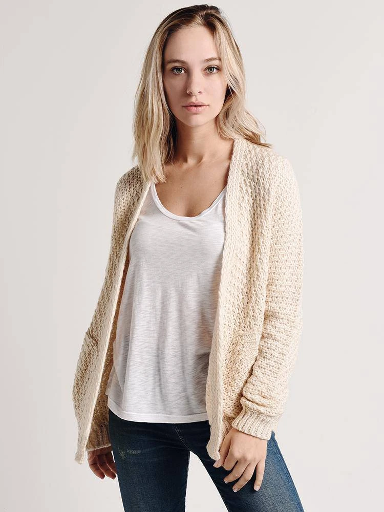 FEATURES:Open front Front pockets Chunky knit 86% arcylic, 15% woolStyled with Velvet tee Style # LILO03, Citizens of Humanity jeans Style # 1416C-989 and Philippe Model sneakers Style # CLLD 1005. Model is wearing size small cardigan, size small tee and size 26 jean.