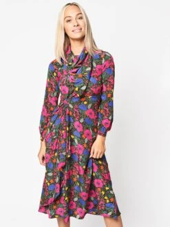 FEATURES:Long Sleeve DressCrew NecklineGathered DetailRemovable Handkerchief IncludedMidi LengthLightweightBold Floral Print100% SilkStyled with Senso heeled sandal style # PRISCILLA. Model is wearing size 0 dress.