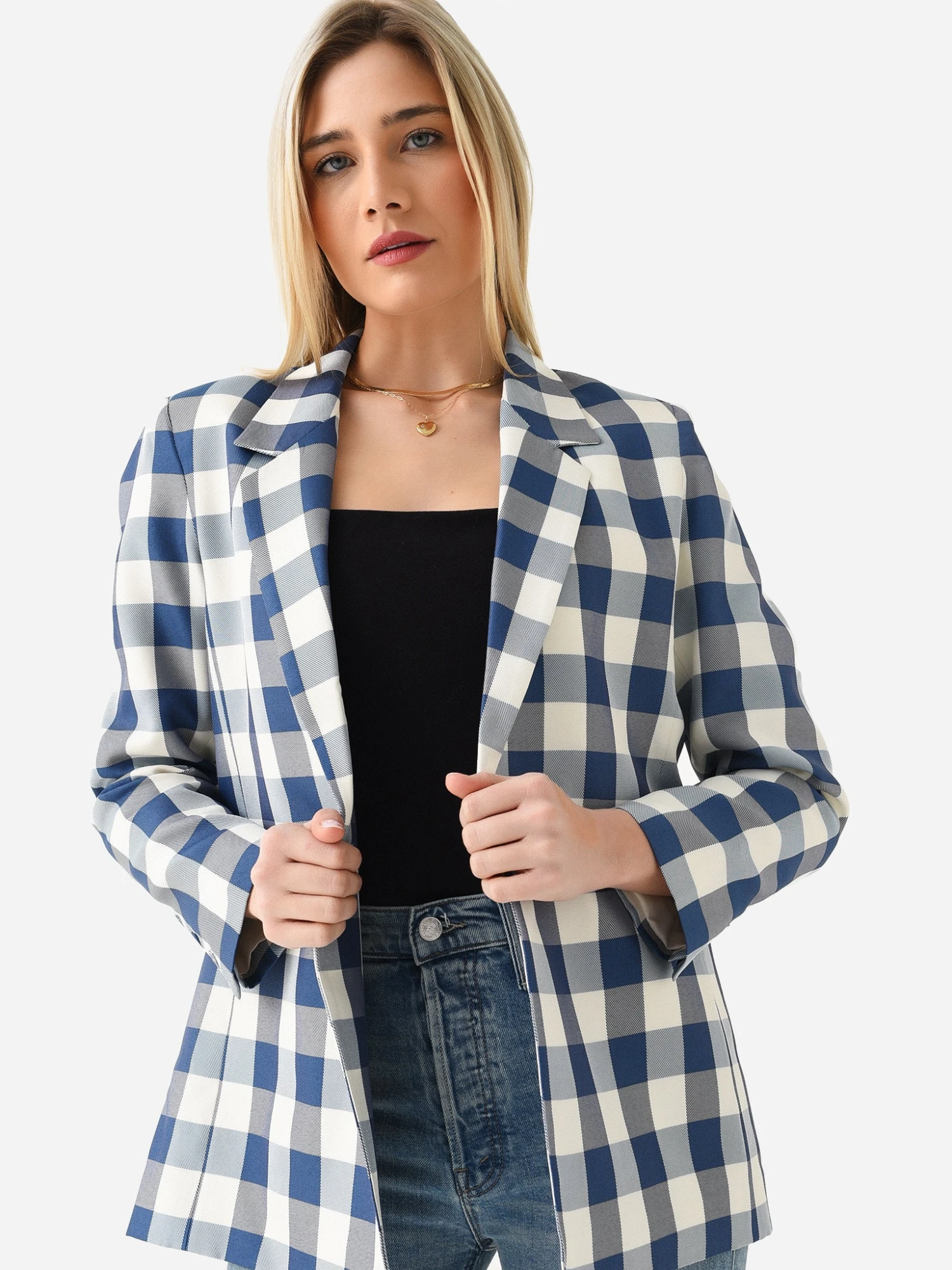 Checker-printed blazer with a notch lapel and welt pockets.