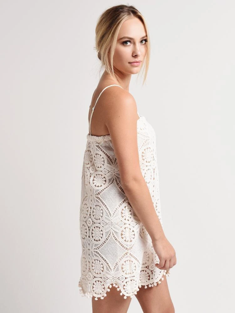 FEATURES:Straight neckline with elastic Adjustable straps Crochet fabric Scalloped hem with pompom trim Fully lined 100% polyester Dry clean Imported Styled with Valia Gabriel sandal Style # GRACE#. Model is wearing size small dress.