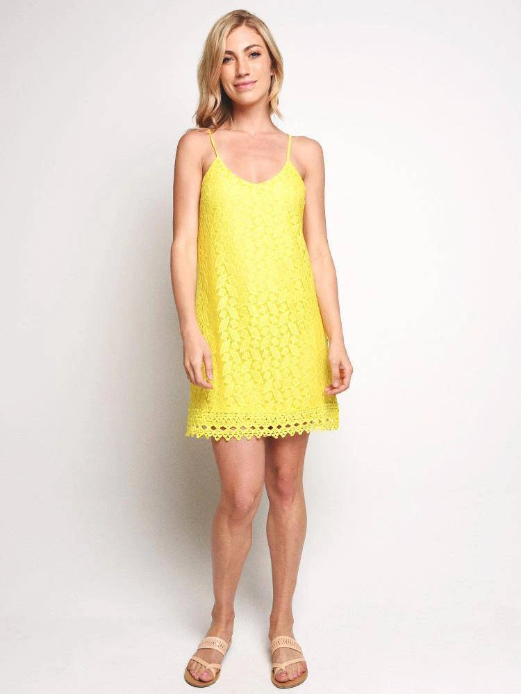 FEATURES:Sheath silhouette.Adjustable shoulder straps.Sheer lace trim at the straight hemline.90% polyester, 10% spandex.Hand wash and hang dry.ImportedModel is wearing size small dress.