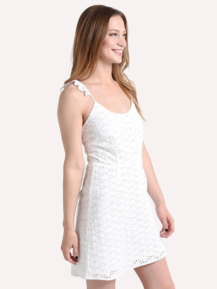 FEATURES:Mini DressRuffle Strap DetailCross Back DetailFaux Button Detail on FrontEyelet DetailsAdjustable Straps at BackShell: 100% Cotton, Lining: 100% CottonStyled with Soludos wedge Style # 1000228. Model is wearing size 4 dress.