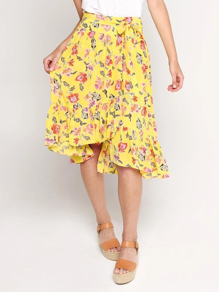 FEATURES:23 front length; 30 back length (size 8)Hidden side-zip closureRemovable tie beltLined100% silkDry cleanImportedStyled with Soludos Style # 1000228-251. Model is wearing size 2 skirt.