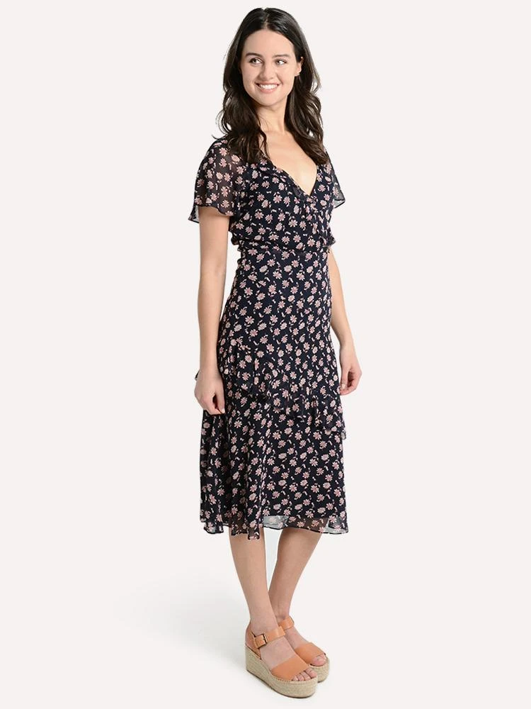 FEATURES:45 length (size 8)Hidden side-zip closureSurplice V-neckShort flutter sleevesBlouson waistLined, except sleeves100% silkDry cleanImportedStyled with Soludos style # 1000228-251. Model is wearing size 2 dress.