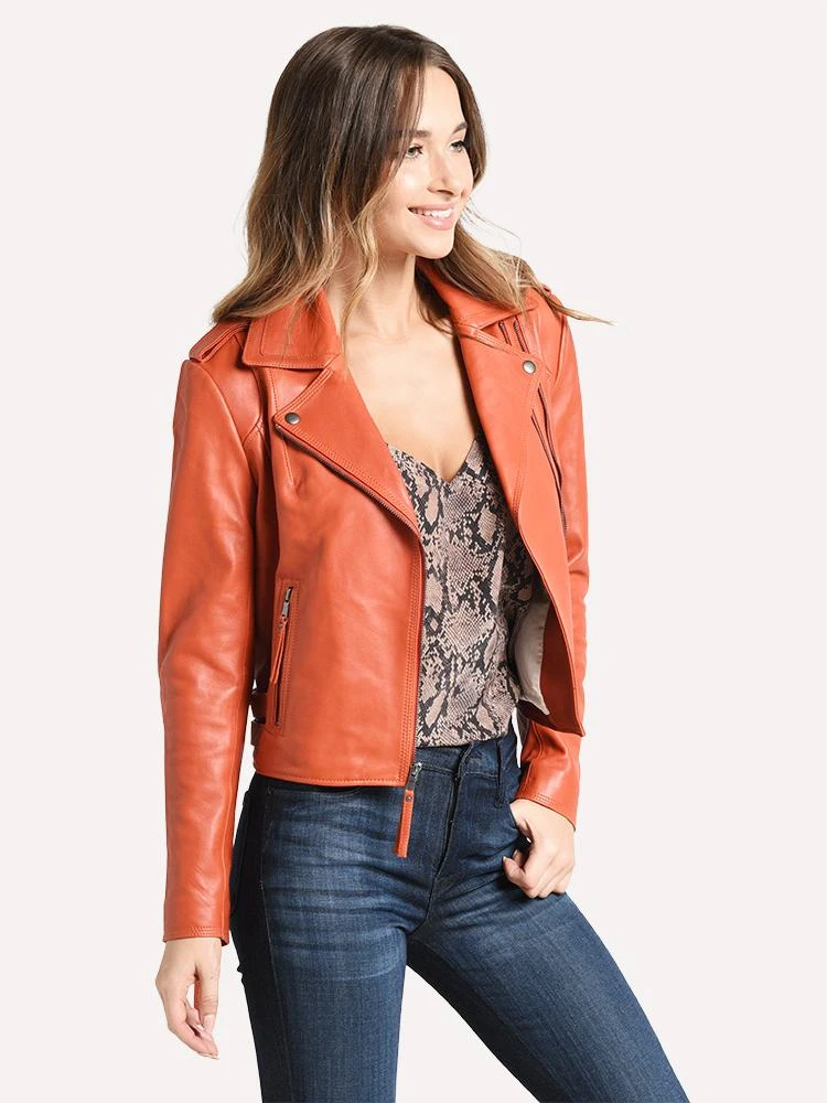 FEATURES:Leather JacketBiker StylingCropped Fitted CutHardware DetailsAsymmetircal Zipper Closure2 Side Zip PocketsButton Tab Detail at ShouldersBuckle Tab Details at HipPeak LapelShell: 100% Lamb, Lining: 96% Polyester, 4% ElastaneDry Clean Only – Leather Specialist OnlyStyled with Frame cami style # LWSH1364, Frame jean style # LHSK159 and Schutz heeled sandal style # ANNA LEE. Model is wearing size Small jacket, cami and size 25 jean.