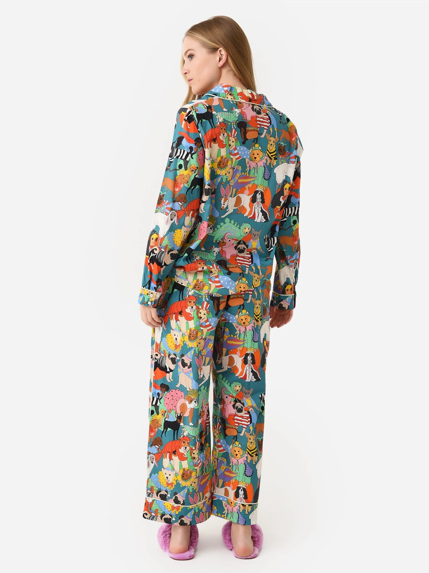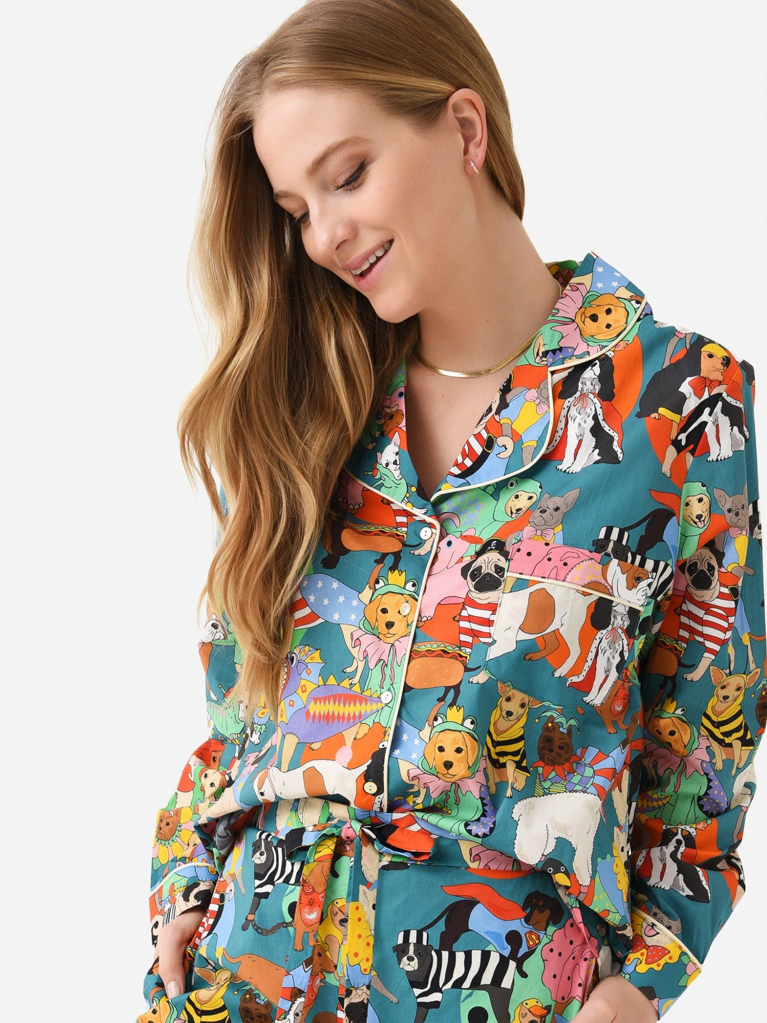 FEATURES:Pajama SetNotch CollarLeft Chest PocketLong SleeveButton-Down FrontStraight HemMatching PantElastic Waistband with DrawstringSatin PipingAll-Over Novelty PrintLightweight Fabrication100% Organic CottonRelaxed FitModel is wearing size Small pajama set.Model’s Measurements: Height: 5’9.5″ | Bust: 32C | Waist: 26″ | Hips: 35.5″ | Dress Size: 2 (US)