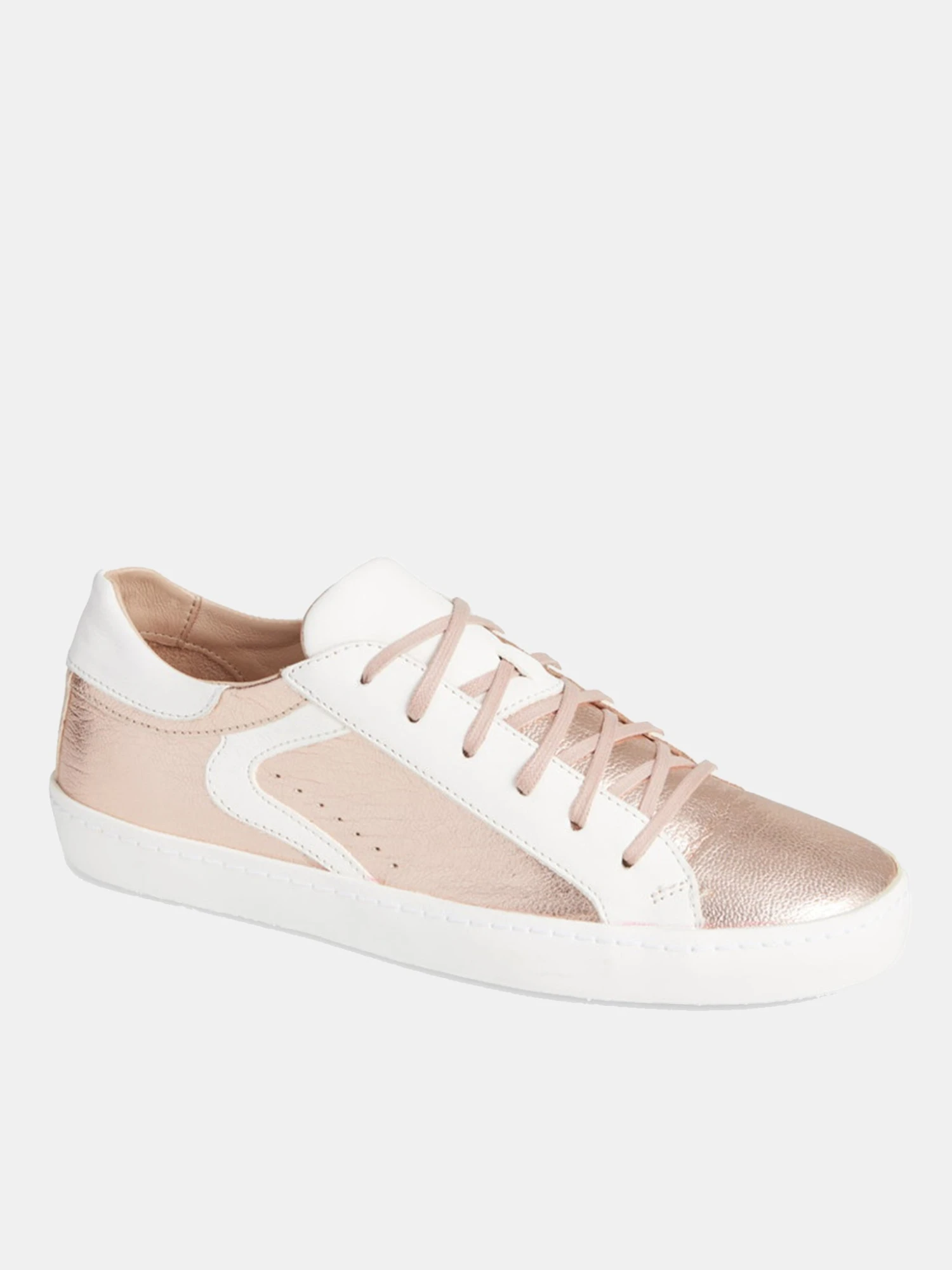 Rose gold metallic accents make this luxurious Italian hand-crafted sneaker a standout around town.