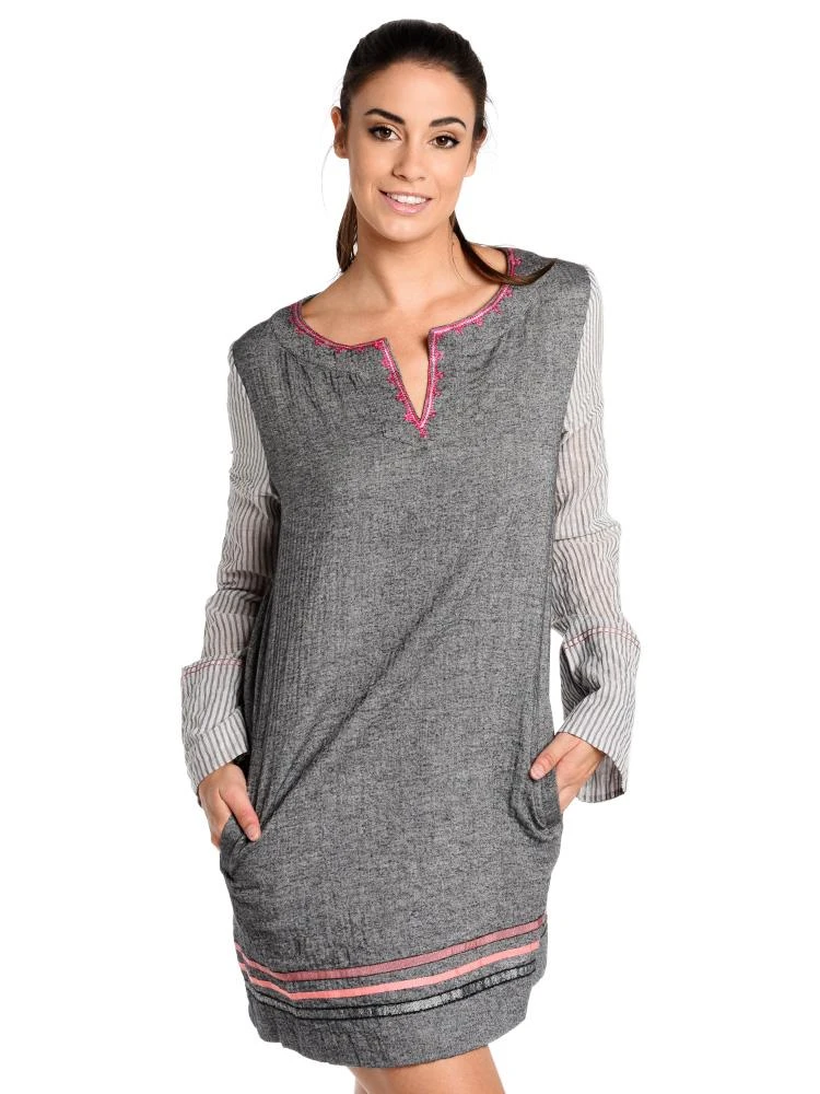 FEATURES:Split neckline Embroidery Slightly belled cuffFront pockets Handwoven 99% cotton, 1% polyester Dry clean only Styled with Vince sneakers Style # E5967F1. Model is wearing size small dress.