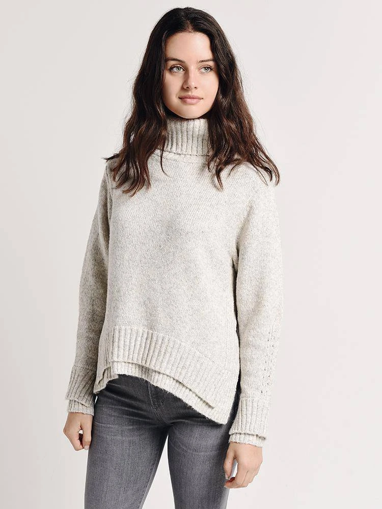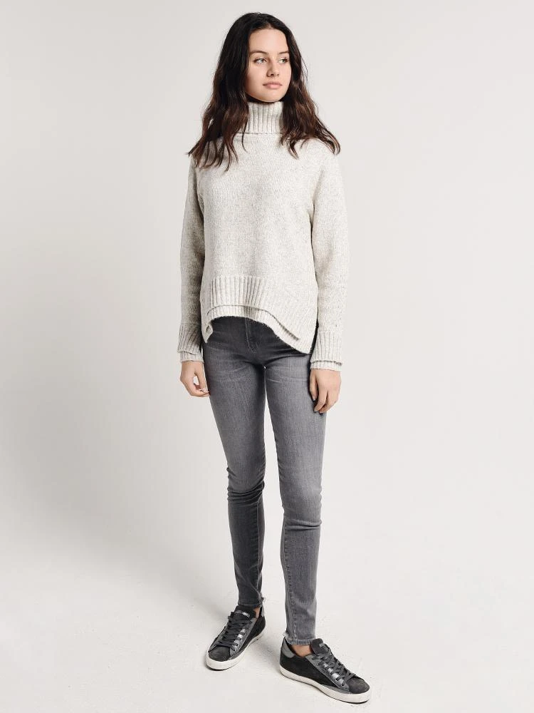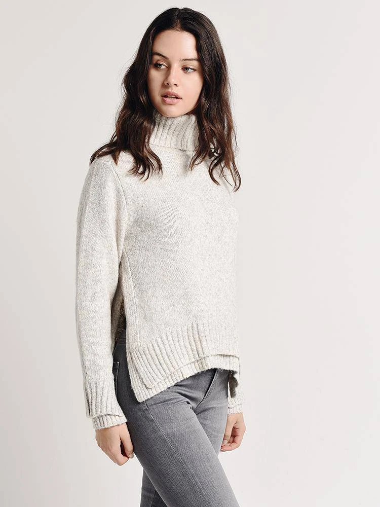 FEATURES:Turtleneck Long sleeves Relaxed fit Double layered fabric on cuffs and hem High side slits 53% acrylic, 26% nylon, 14% cotton, 7% wool Dry clean only Styled with Citizens of Humanity jeans Style # 1416B-979 and Philippe Model sneakers Style # CLLD-XY04. Model is wearing size small sweater and size 26 jean.